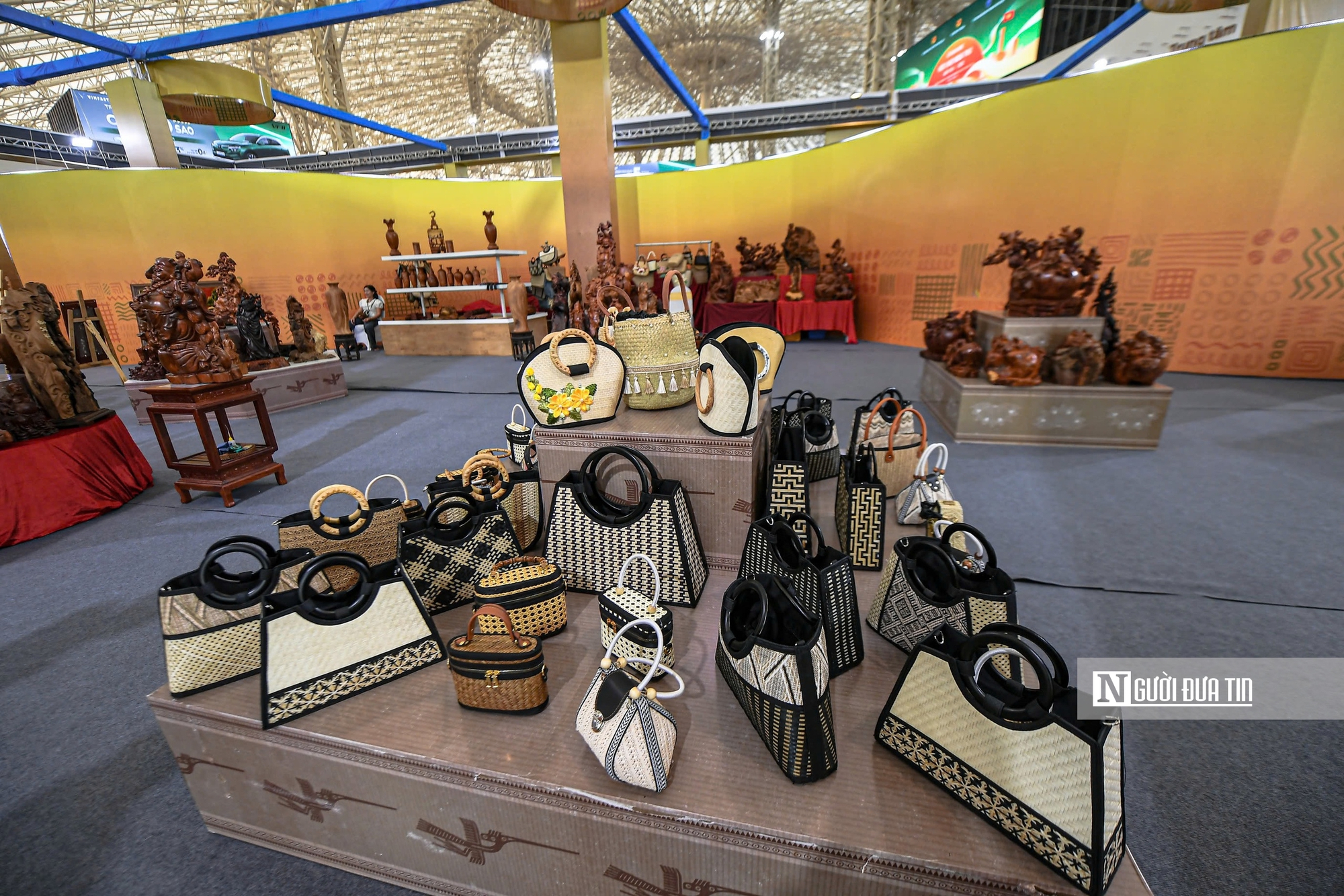 Những chiếc túi thủ công tinh tế từ chất liệu cói, mây, tre thu hút ánh nhìn của du khách trong khu trưng bày sản phẩm làng nghề.