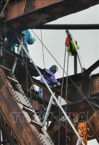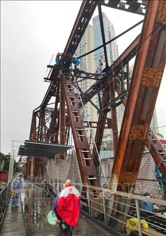 Hàng chục công nhân cùng nhiều thiết bị, vật liệu chuyên dụng tiếp tục vượt khó trong thời tiết mưa, rét của Hà Nội, khẩn trương triển khai sửa chữa, gia cố nhịp 18 cầu Long Biên.