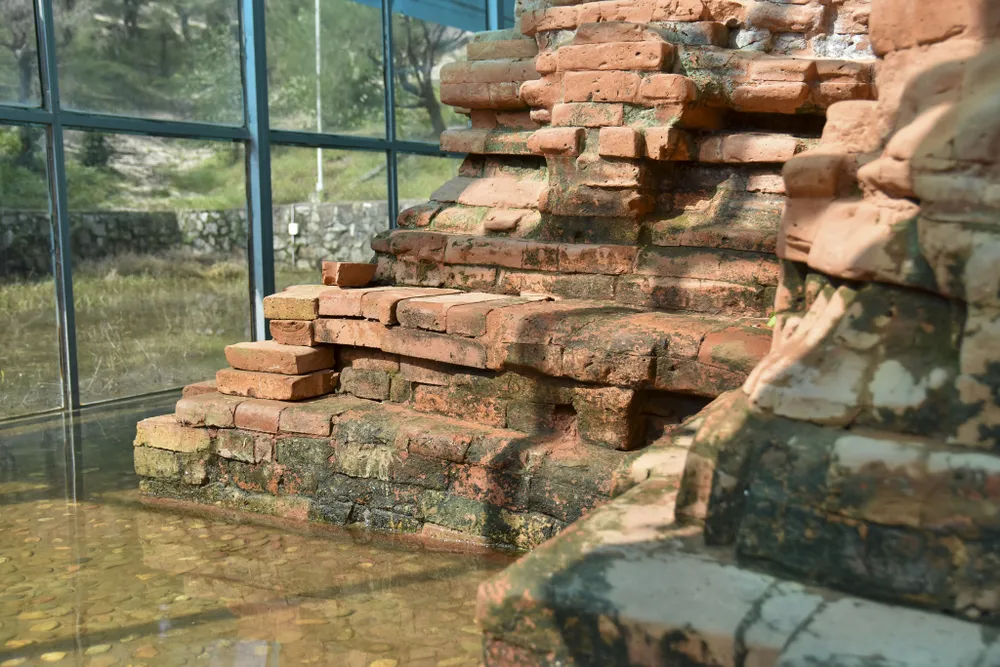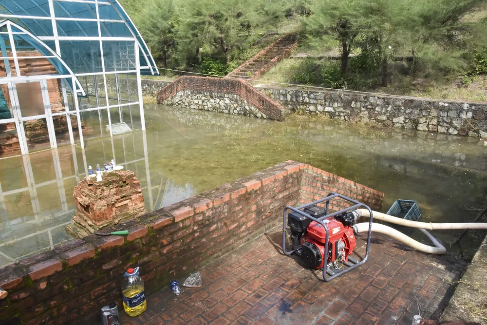 Theo ghi nhận của PV, vào sáng 9-11, khu vực nền móng của tháp vẫn còn ngập trong nước. Hiện, đơn vị quản lý đang sử dụng một máy bơm nước ra ngoài để bảo vệ di tích.