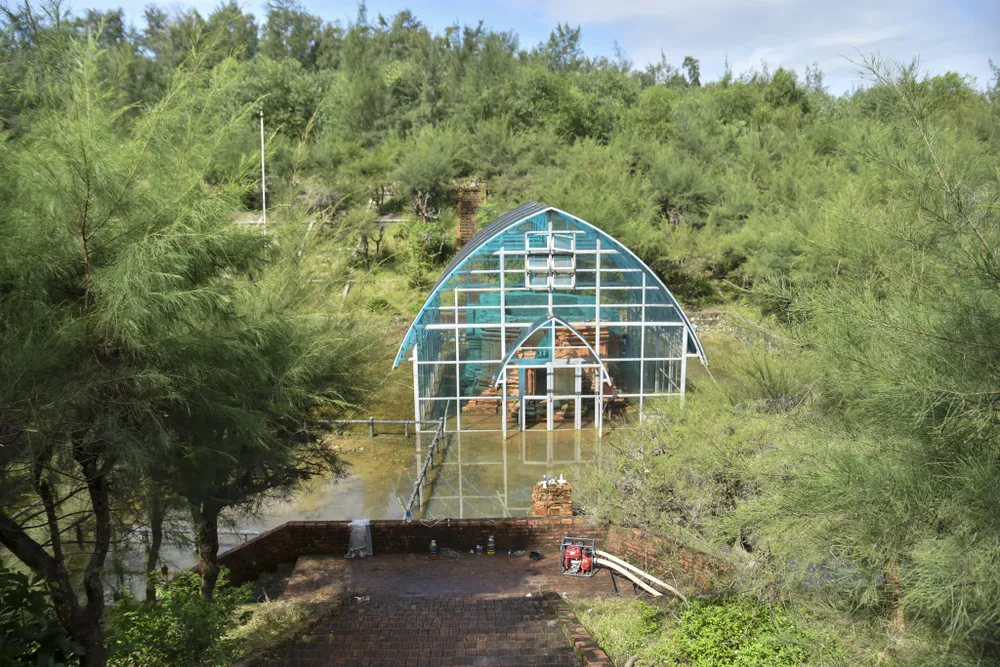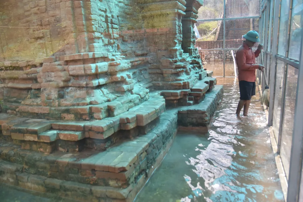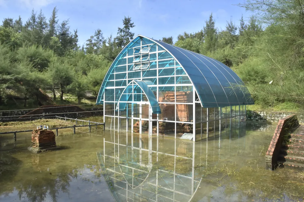 Tuy nhiên, do vị trí tháp nằm âm sâu dưới bãi cát, thấp hơn mực nước biển nên mưa lớn đã khiến toàn bộ khu vực nền móng bị ngập sâu trong nhiều ngày.