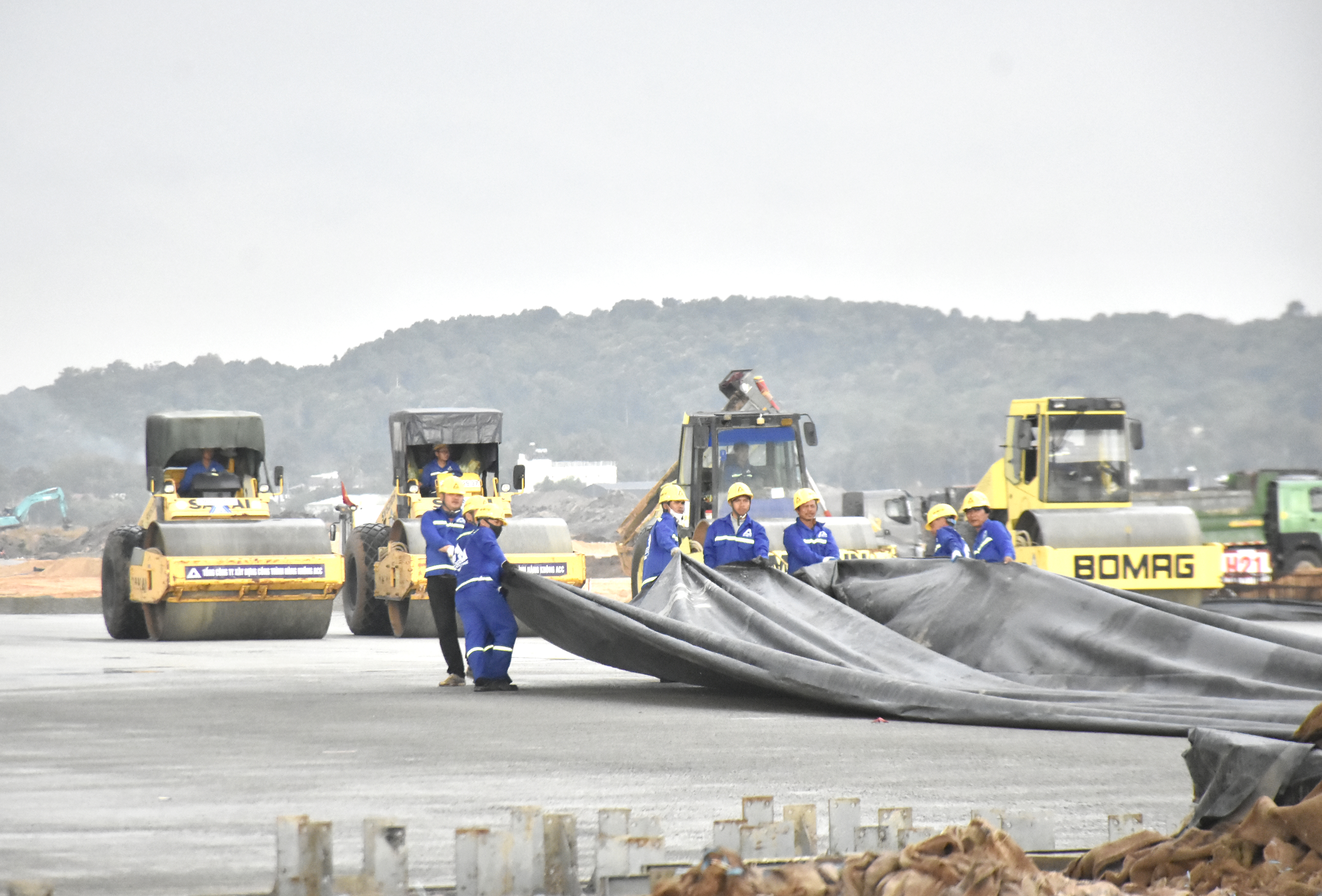 Các nhà thầu huy động hàng trăm công nhân cùng máy móc, thiết bị tổ chức thi công ngày đêm tại đường cất hạ cánh số 2 (dự án mở rộng Cảng hàng không quốc tế Phú Quốc)