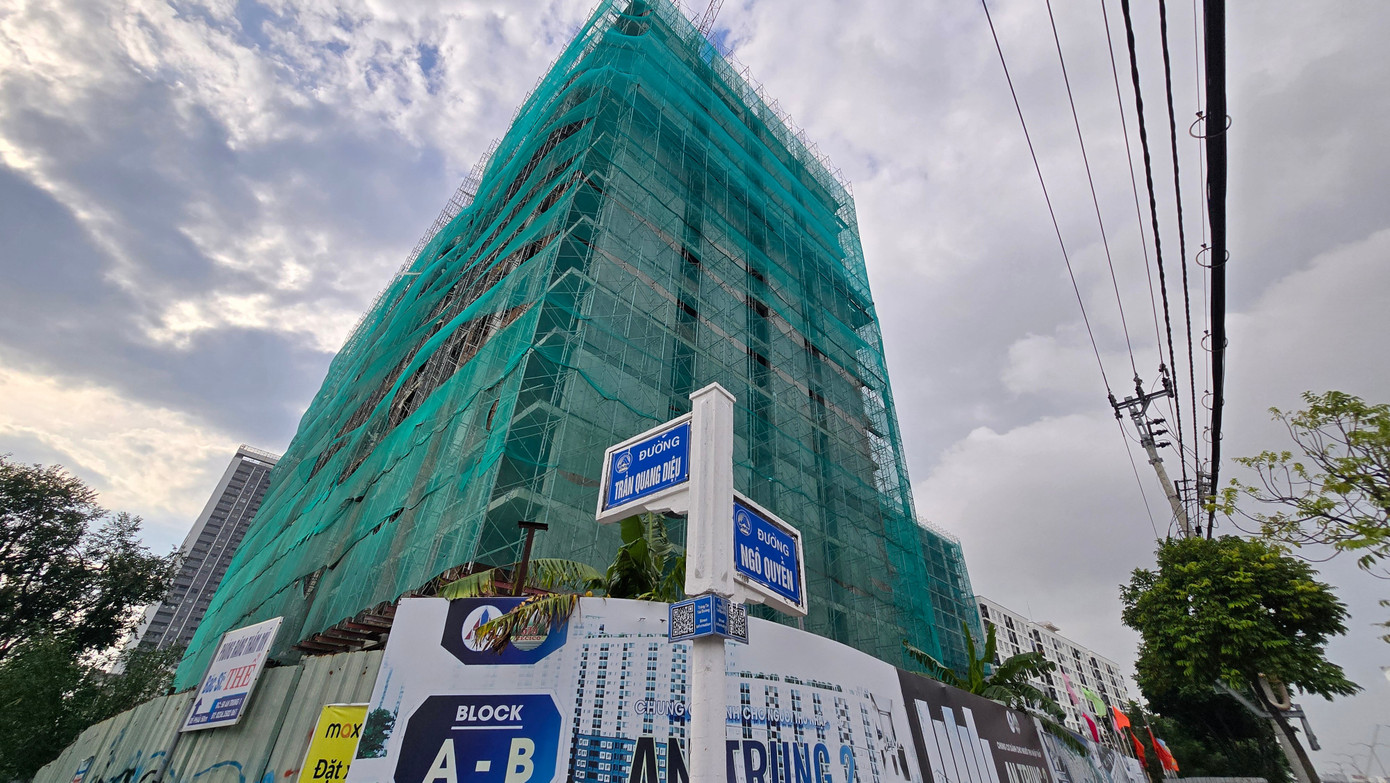 Tại dự án nhà ở xã hội An Trung 2 (đường Ngô Quyền, phường Sơn Trà, TP Đà Nẵng), công trường thi công khẩn trương với 2 block cao trên 15 tầng đã hoàn thiện phần thô, tiến độ được đẩy nhanh.