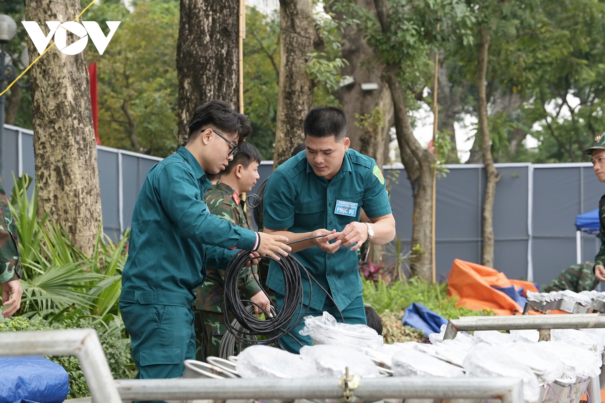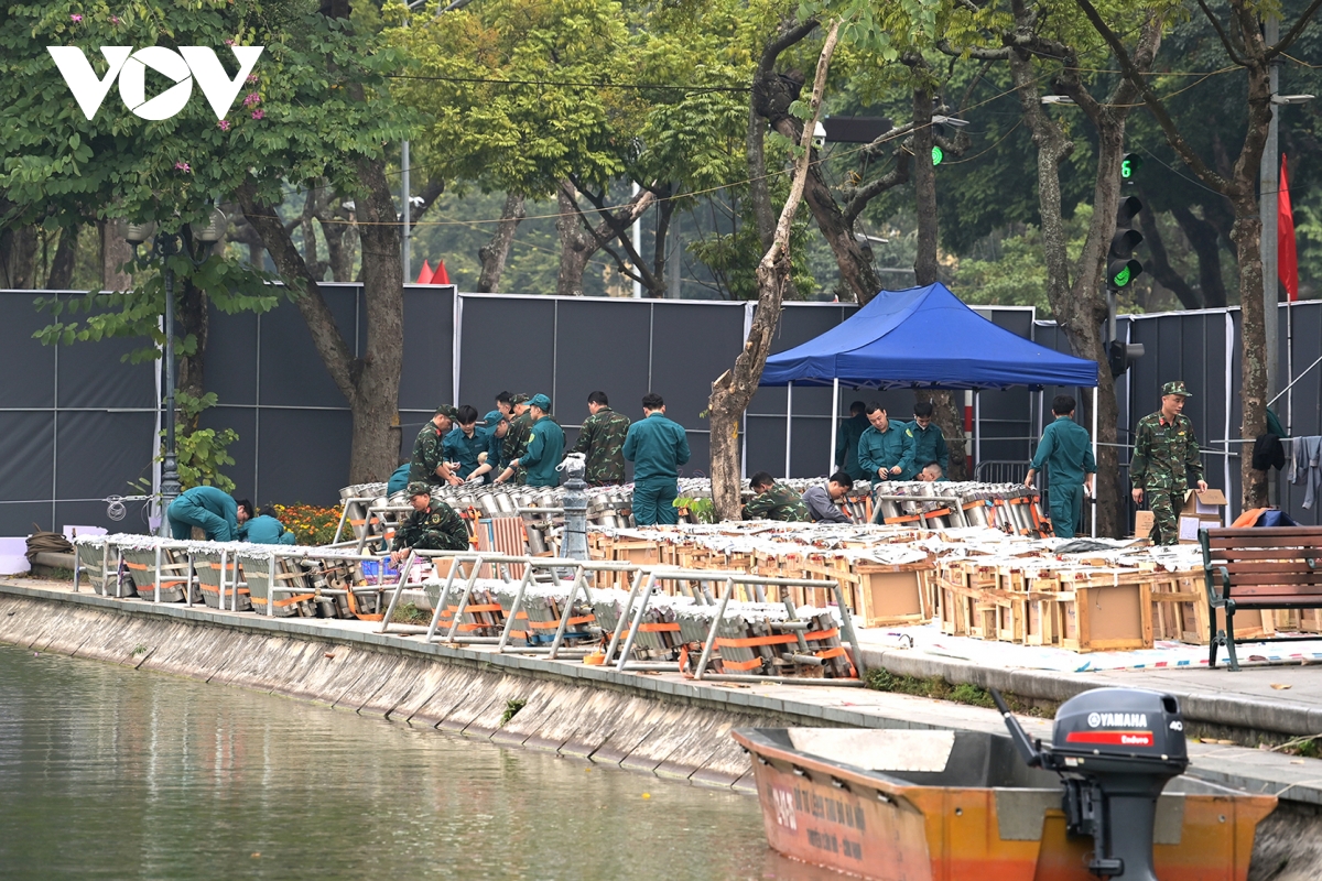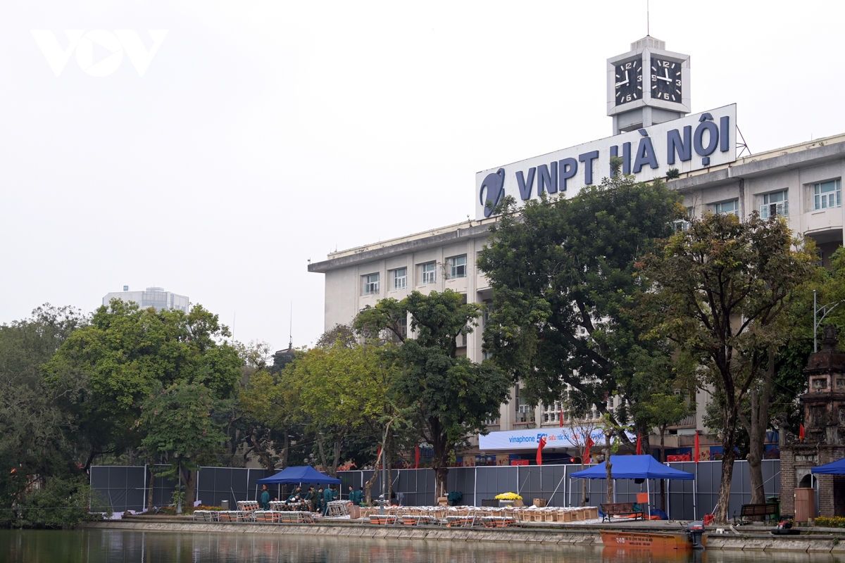 Công tác lắp đặt giàn pháo hoa đang được khẩn trương hoàn tất tại khu vực Bờ hồ Hoàn Kiếm, sẵn sàng cho thời khắc đón năm mới 2026.