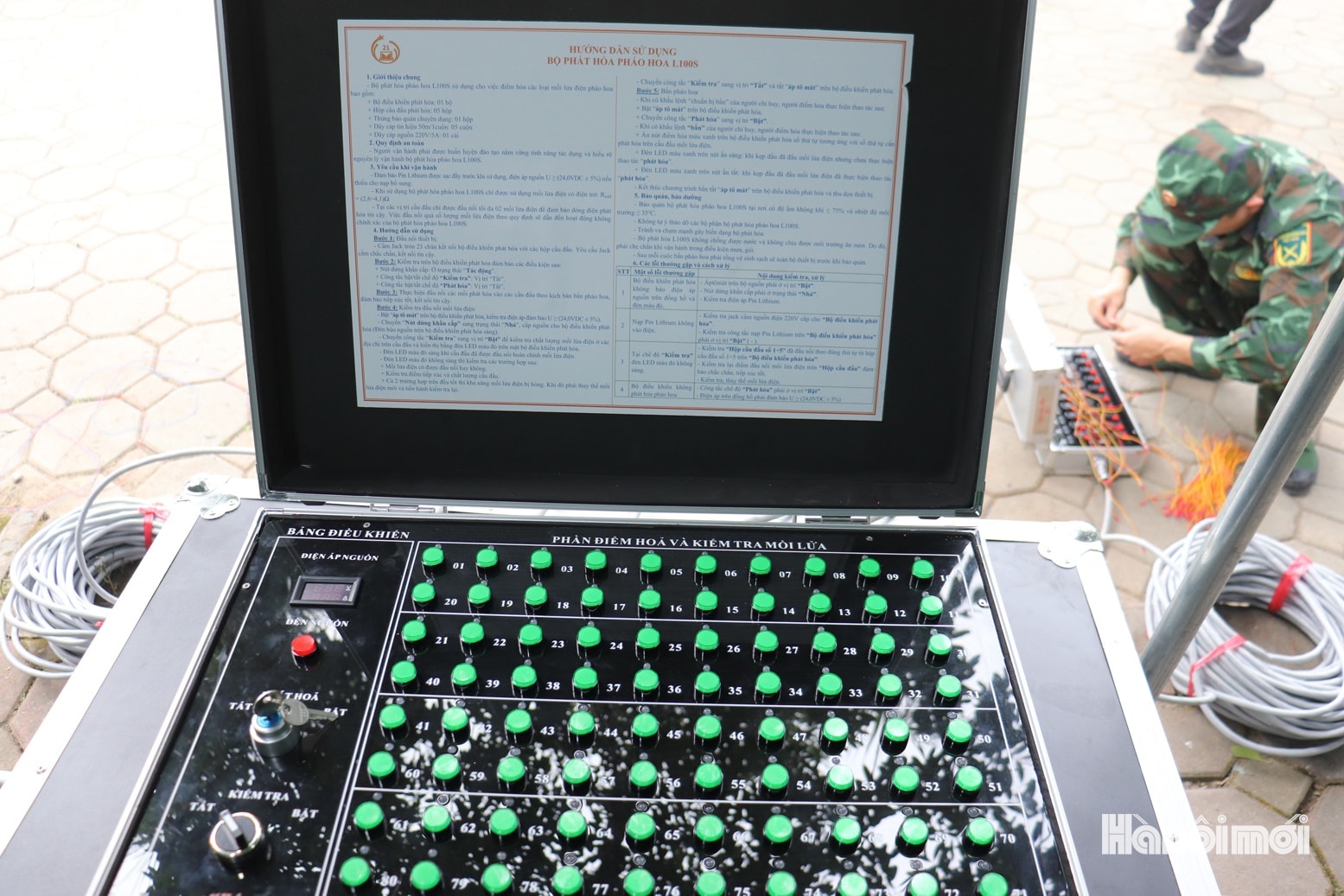 Bảng điều khiển điểm hỏa và kiểm tra mồi lửa tại trận địa bắn pháo hoa hồ Văn Quán, phường Hà Đông. Ảnh: Tuấn Điệp