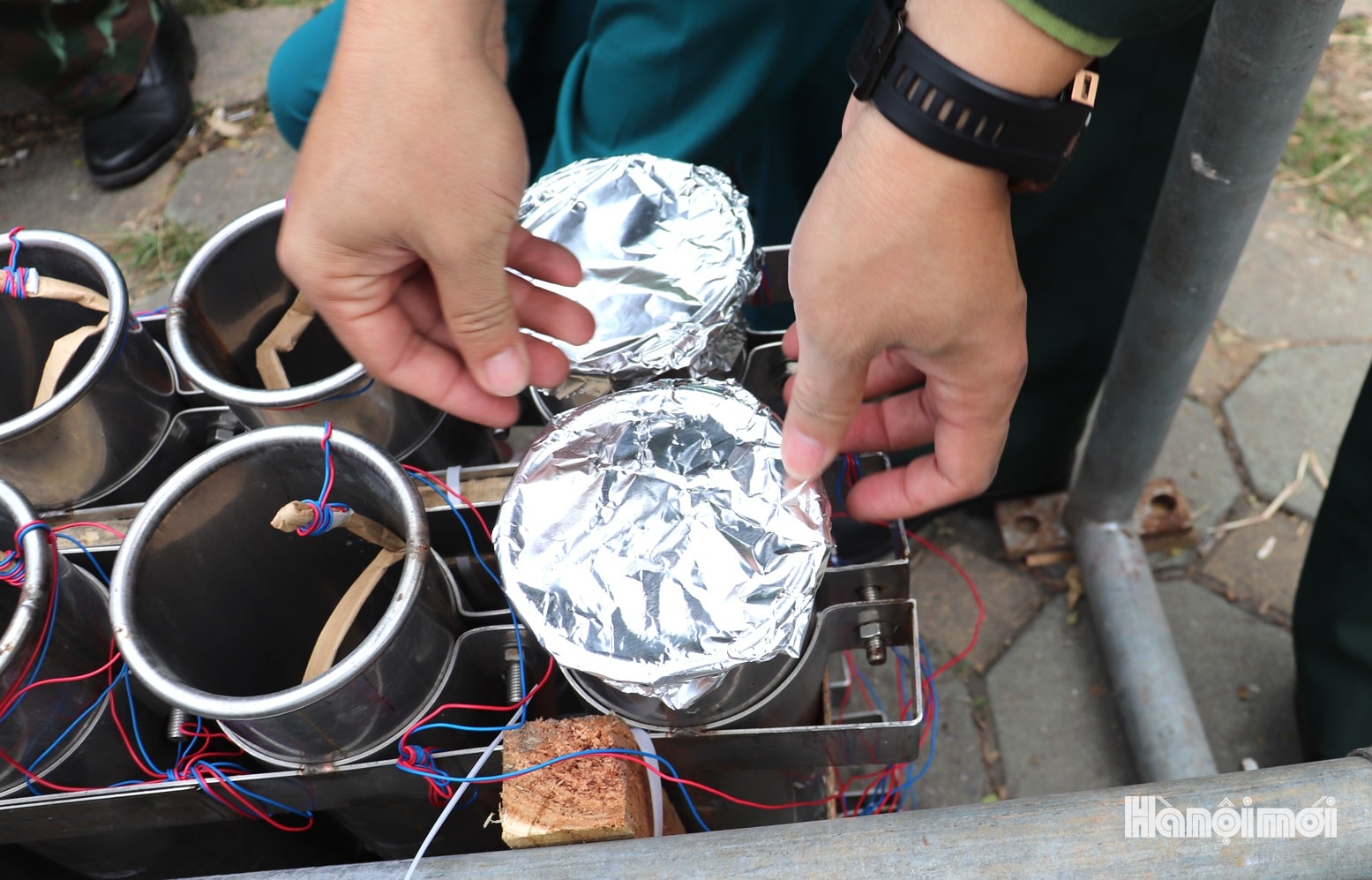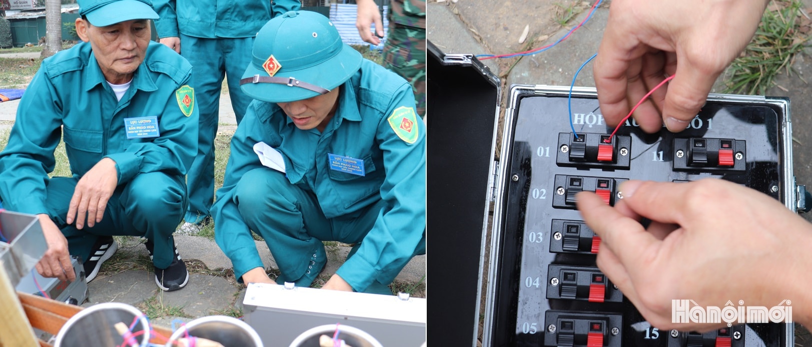 Anh Hoàng Văn Sơn (bên phải), dân quân tự vệ phường Hà Đông, đấu dây mồi lửa điện từ ống pháo vào hộp cầu đấu điểm hỏa. Ảnh: Tuấn Điệp