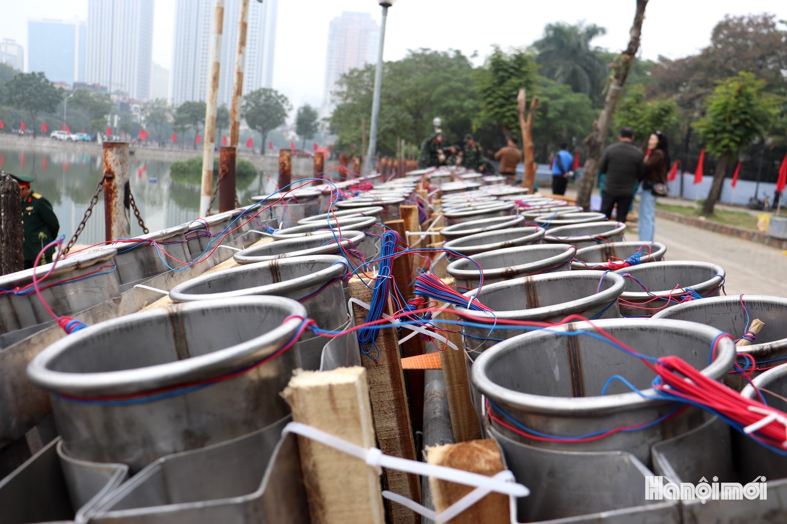 Dưới đây là hình ảnh phóng viên Báo Hànôịmới ghi nhận công tác chuẩn bị tại trận địa pháo hoa hồ Văn Quán, phường Hà Đông, sáng 31-12.