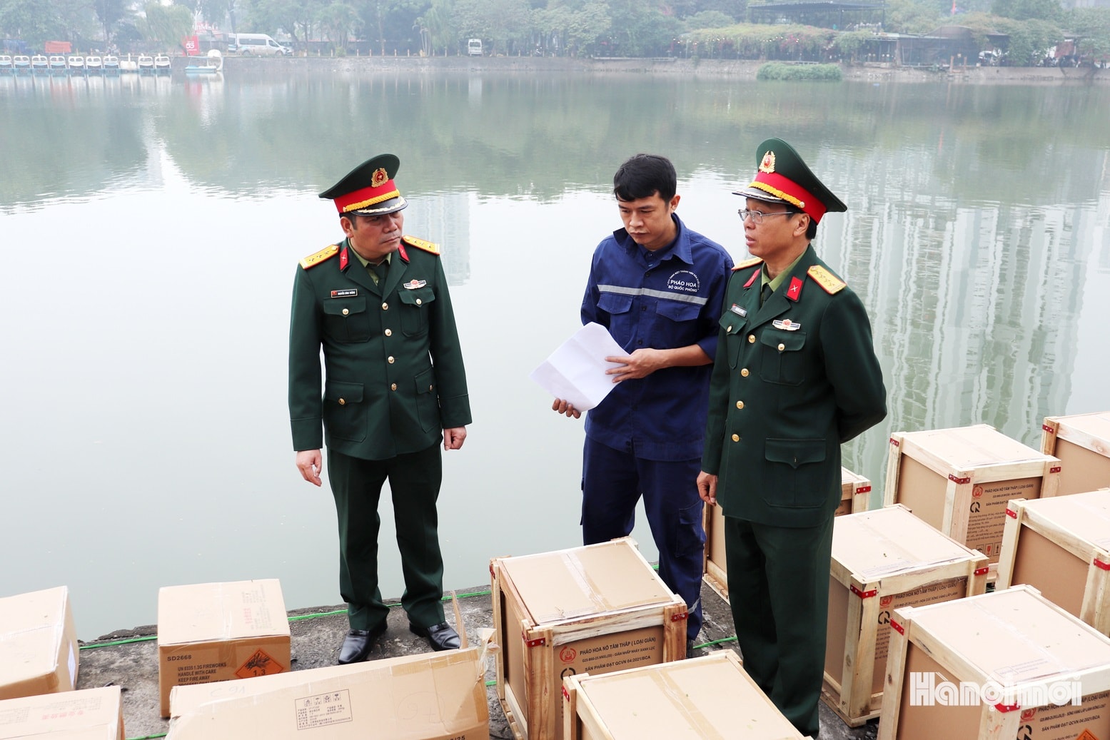Thượng tá Nguyễn Đình Thắng (ngoài cùng bên trái) cùng cán bộ, chiến sĩ kiểm tra trận địa bắn pháo hoa tại hồ Văn Quán, phường Hà Đông. Ảnh: Tuấn Điệp