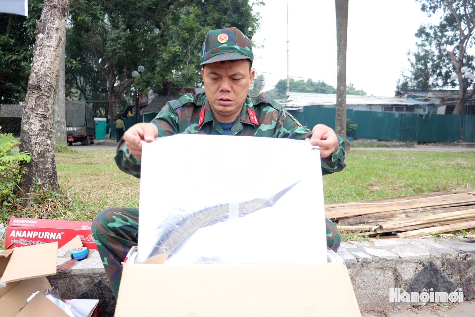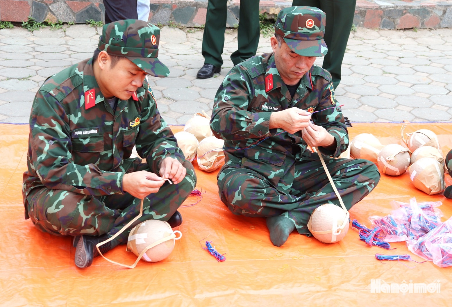 Các chiến sĩ bộ đội đóng nẹp để cố định giàn pháo hoa tầm thấp. Ảnh: Tuấn Điệp