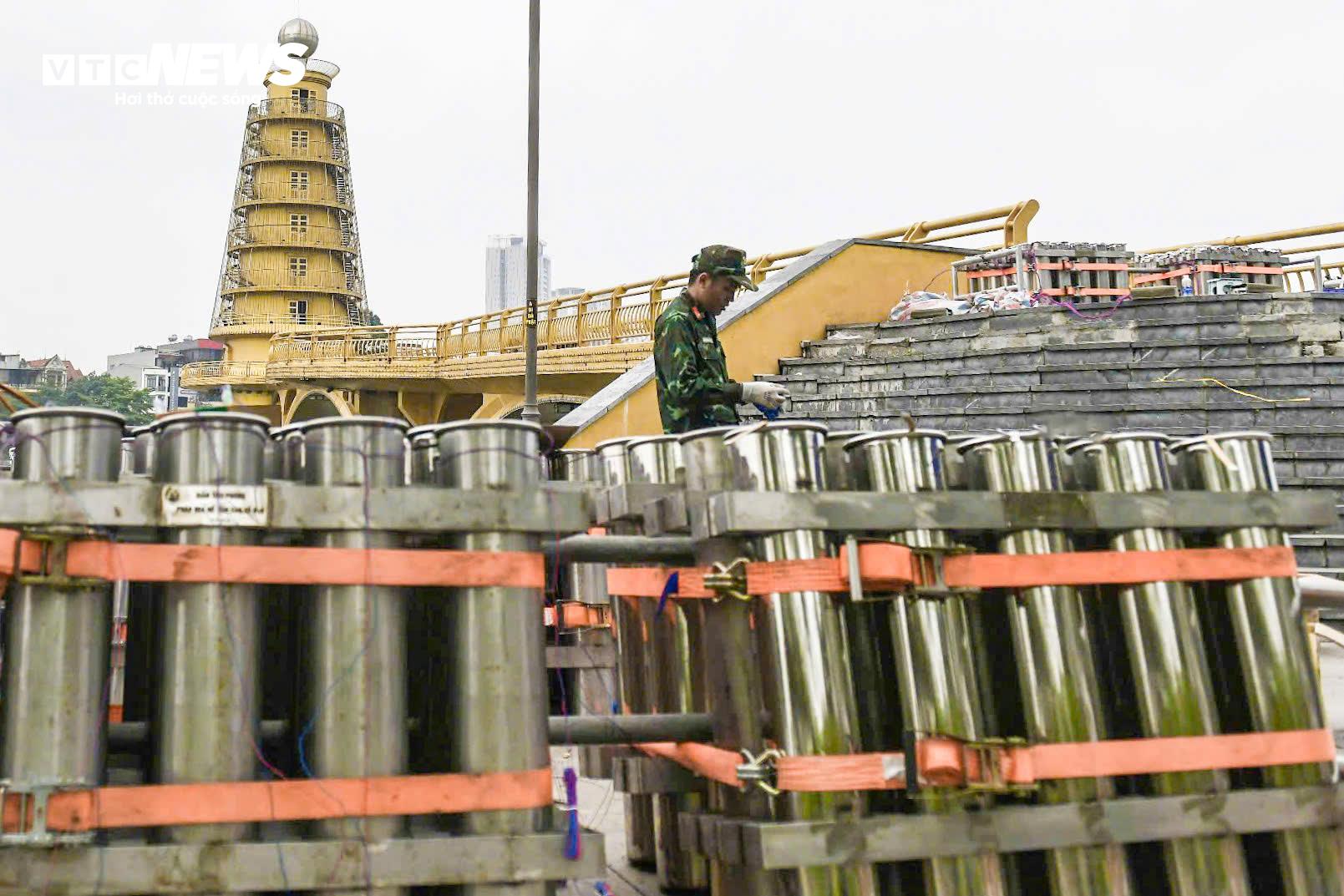 Chiều 25/4, tại khu vực cầu đi bộ Công viên Văn Lang (phường Việt Trì, tỉnh Phú Thọ), các lực lượng chức năng khẩn trương hoàn tất những công đoạn cuối cùng của trận địa pháo hoa, sẵn sàng cho màn trình diễn đặc biệt trong đêm 9/3 Âm lịch.