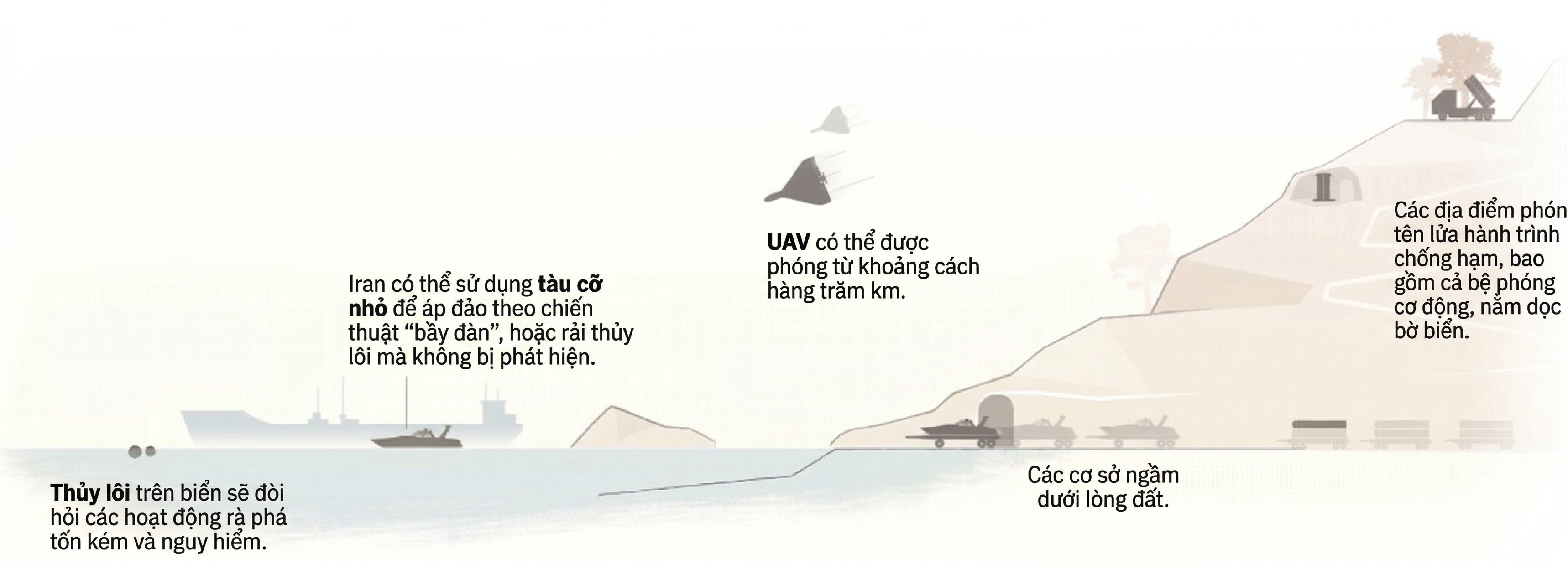 Các loại vũ khí có thể tương đối nhỏ, nhưng chính điều đó cho phép Iran giấu chúng trong vách đá, hang động và đường hầm, rồi triển khai ở cự ly gần dọc theo bờ biển. “Chính sự gần kề của Iran và độ rộng của eo biển khiến mọi thứ trở nên rất khó khăn” - bà Jennifer Parker, cựu sĩ quan hải quân hiện làm việc tại Trường Cao đẳng An ninh Quốc gia thuộc Đại học Quốc gia Úc, nói.