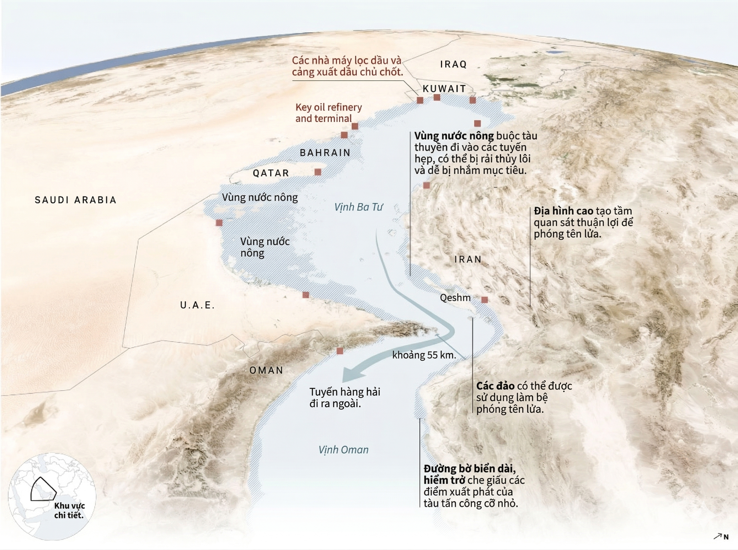 Địa hình tại khu vực eo biển Hormuz. Đồ họa: THE NEW YORK TIMES. Việt hóa: AI