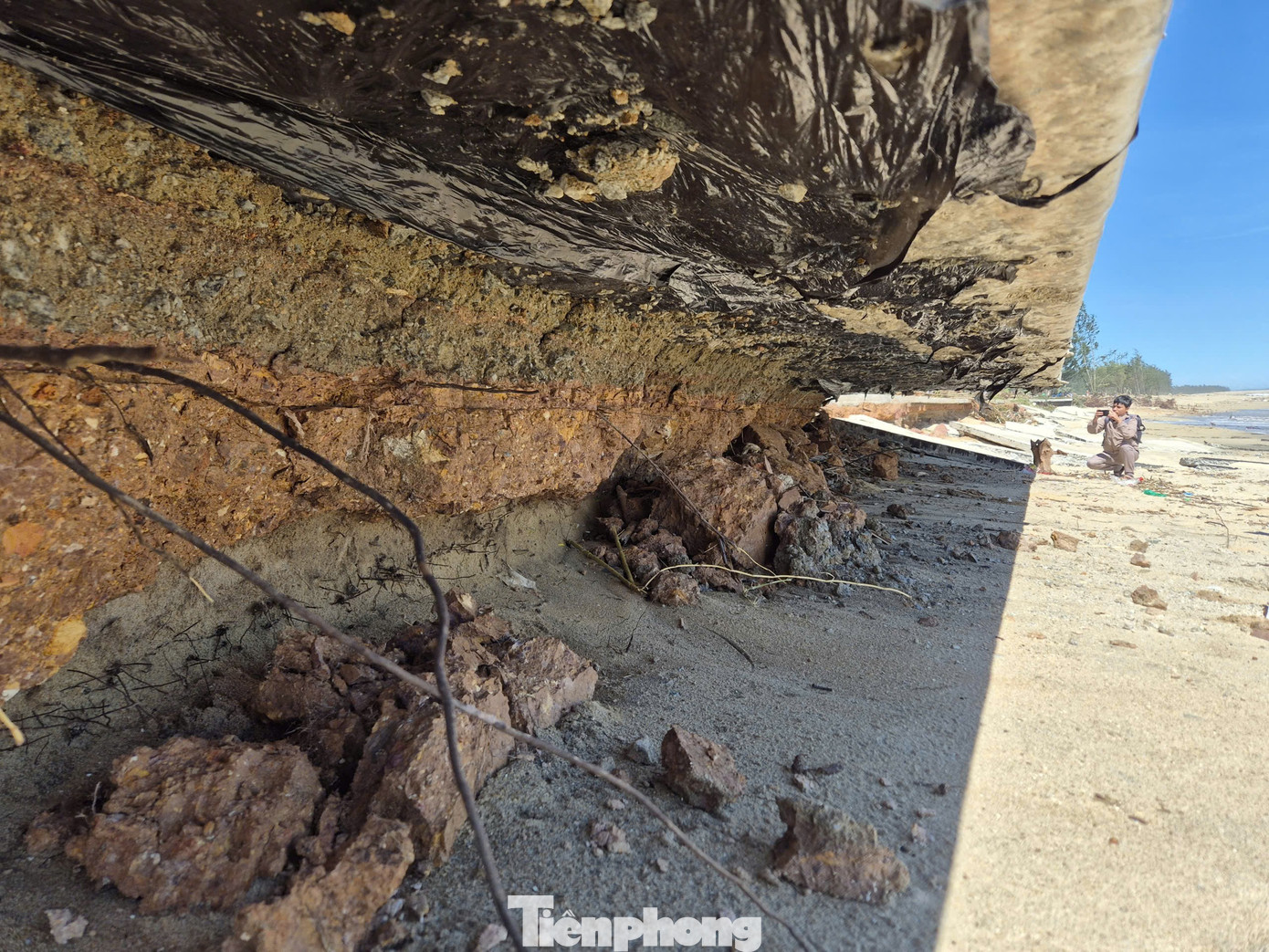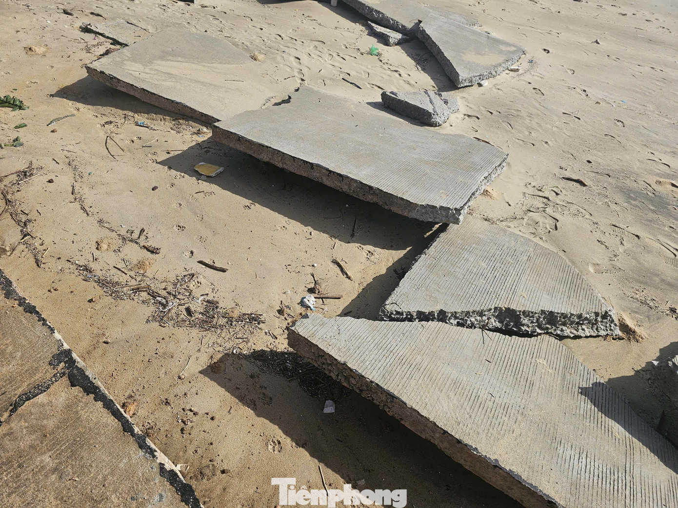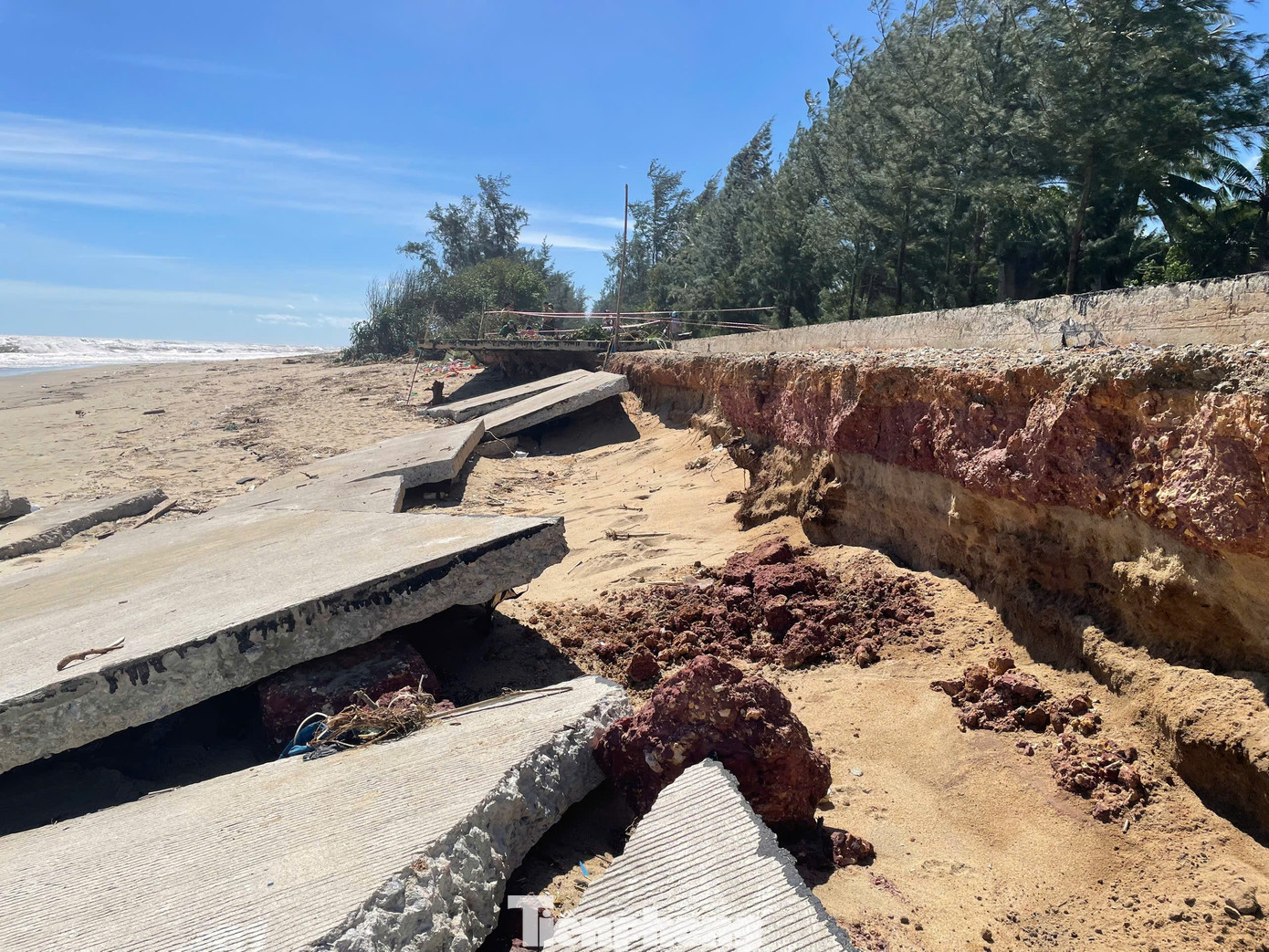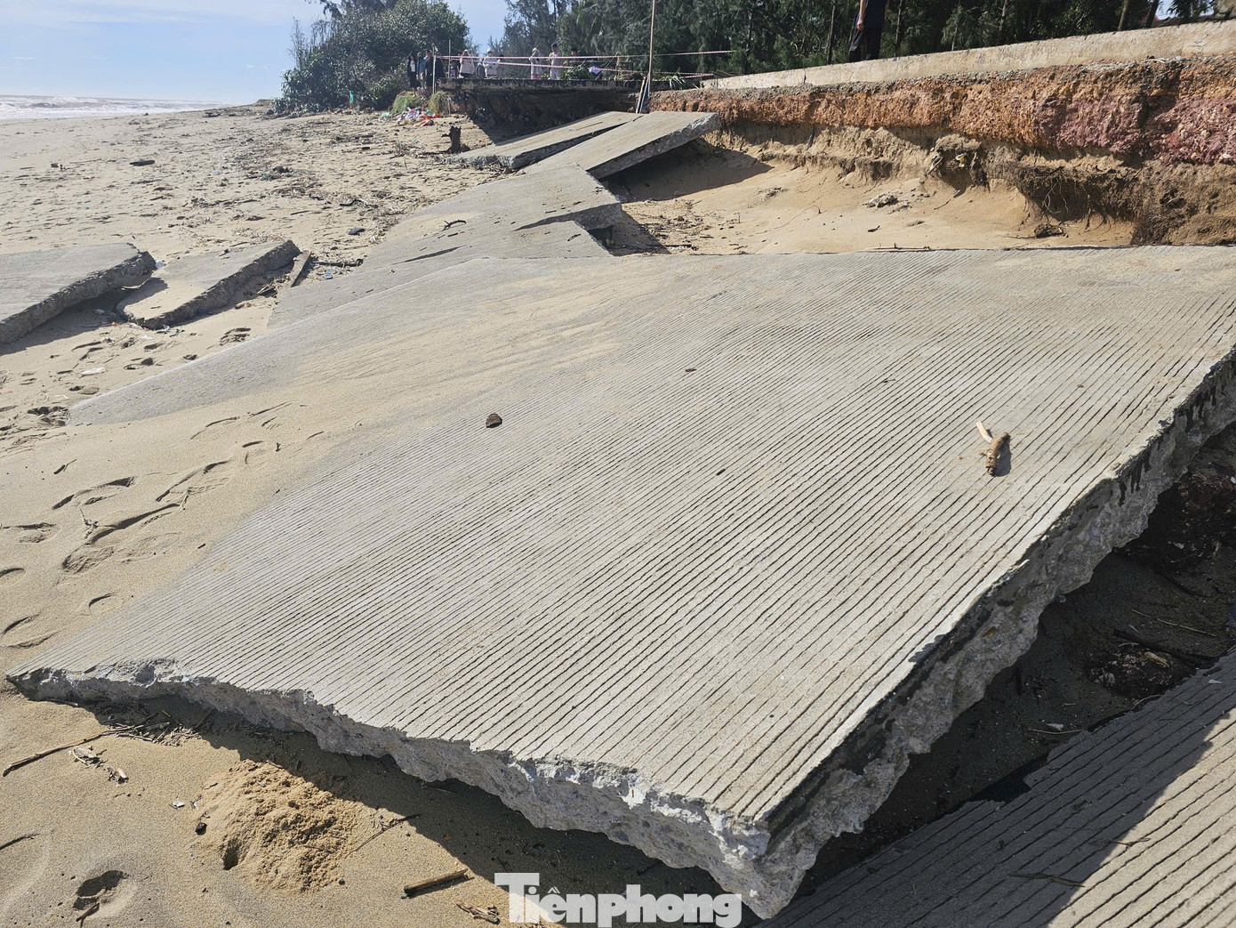 Nền đường bị khoét rỗng, từng mảng bê tông rạn nứt, trượt xuống bãi biển.
