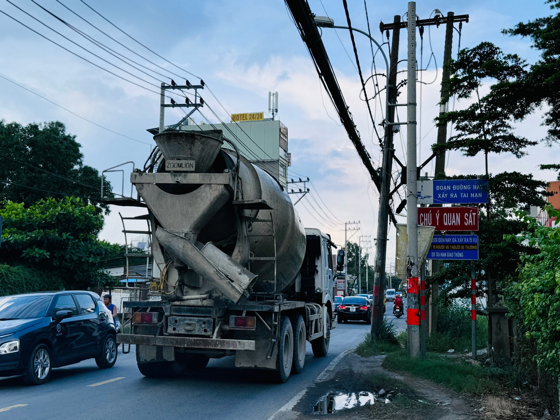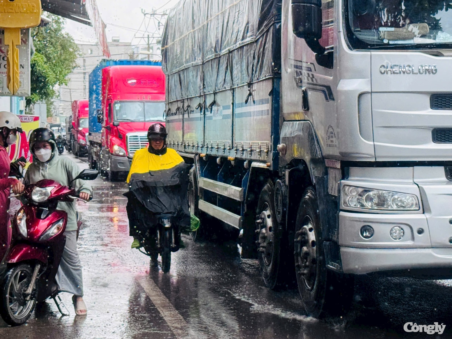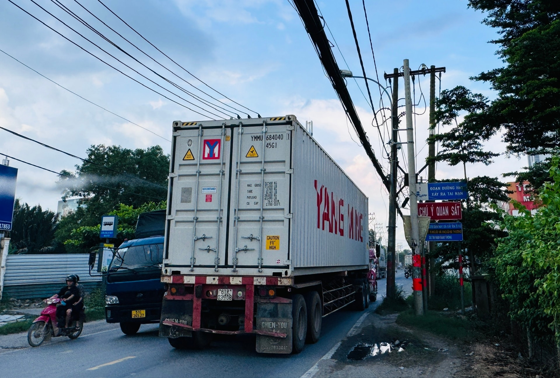 Hình ảnh người dân đi xe máy len lỏi ngay cạnh những cỗ container khổng lồ, chỉ cần một sơ suất nhỏ cũng có thể dẫn đến tai nạn thương tâm.