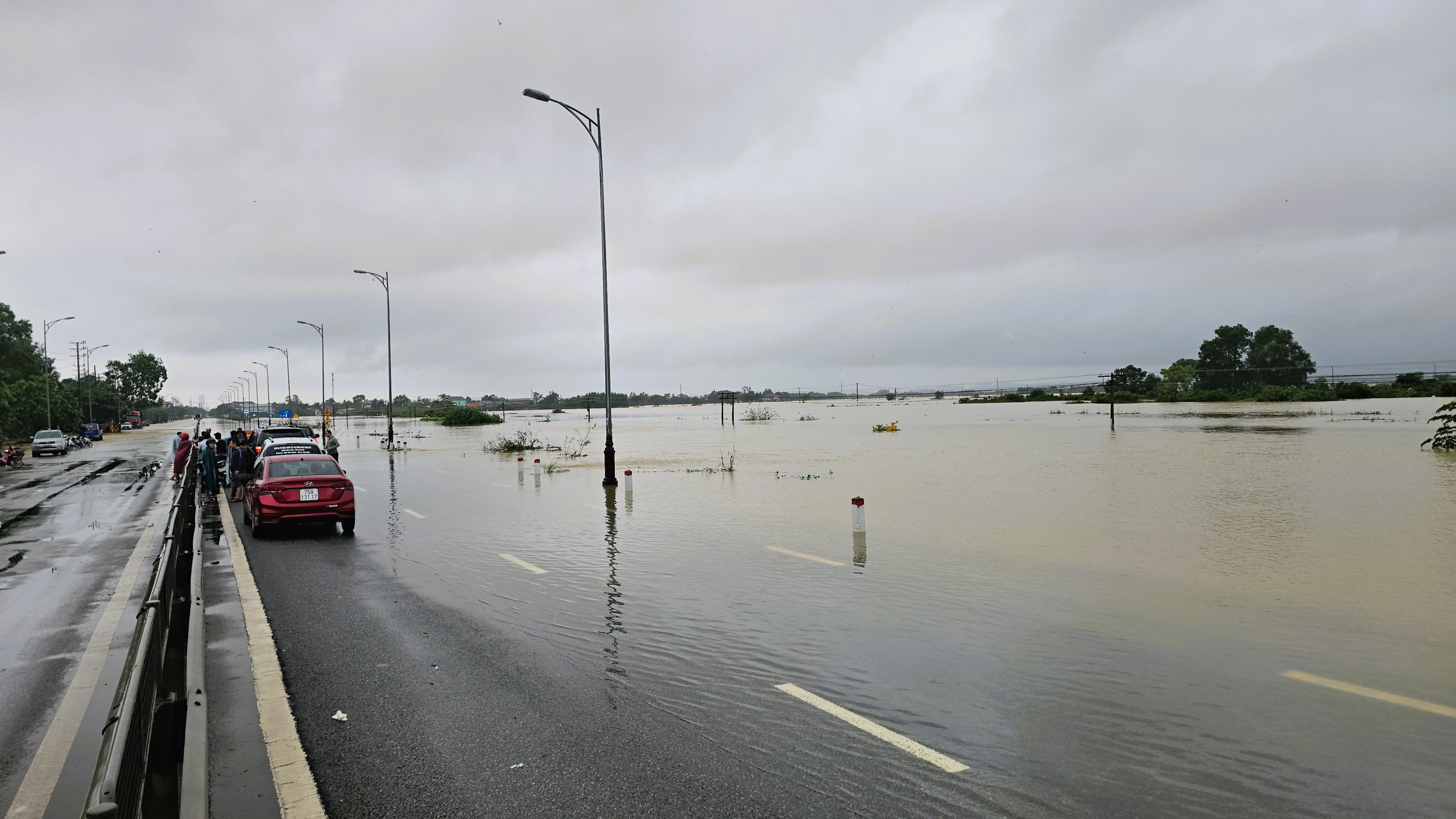 Đến cuối giờ chiều 28/10, quốc lộ 1 đoạn phía Bắc cầu An Lỗ tái ngập trở lại so với thời điểm trưa cùng ngày, nhưng các phương tiện ô tô, xe máy vẫn qua lại được.
