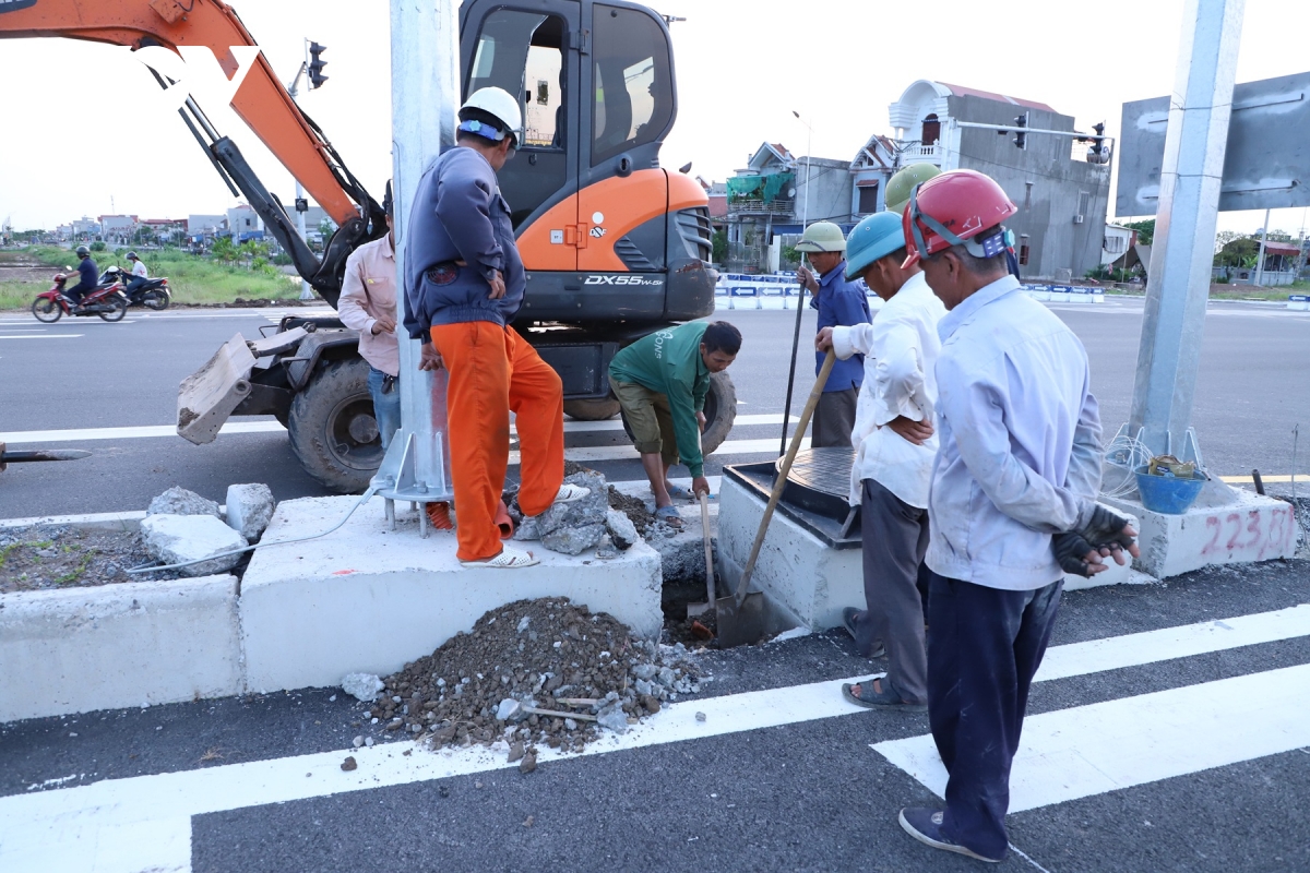 Tại nút giao tuyến đường Nam Định - Lạc Quần, công nhân đang khẩn trương hoàn thiện hệ thống đèn chiếu sáng và đèn tín hiệu, đảm bảo an toàn giao thông và tiến độ thi công.