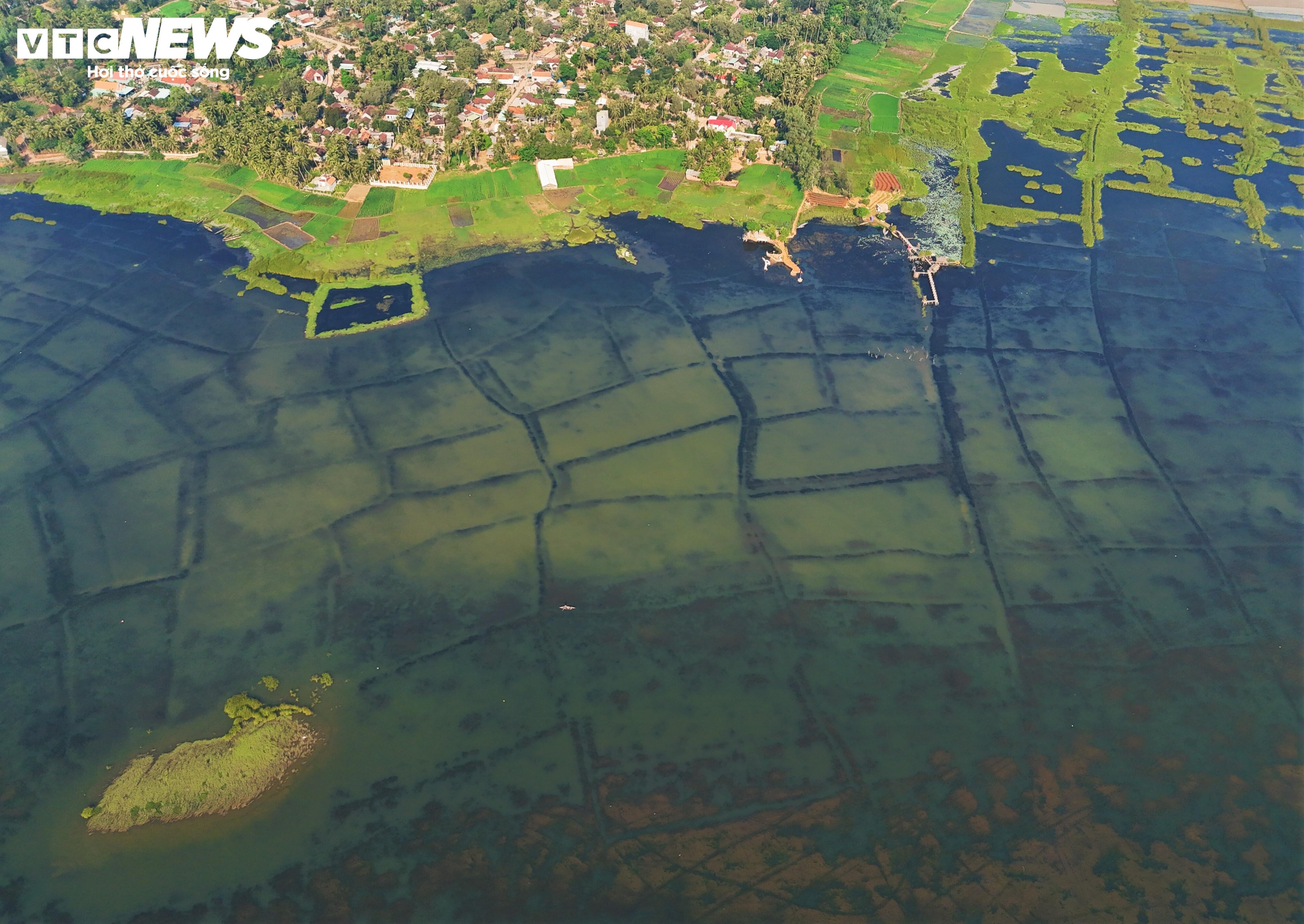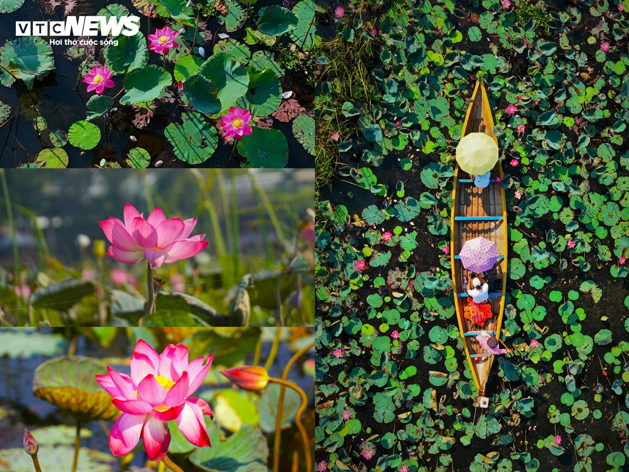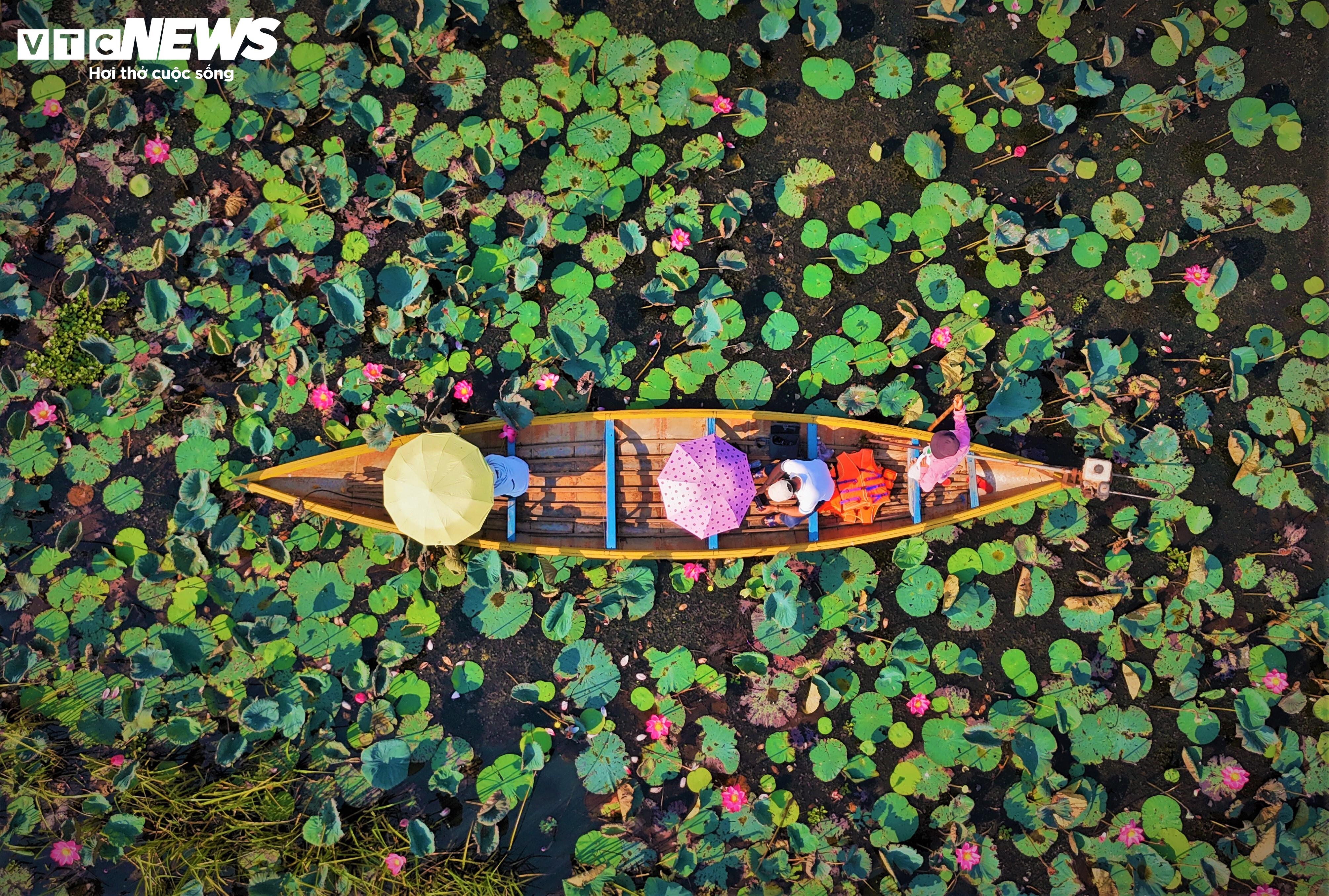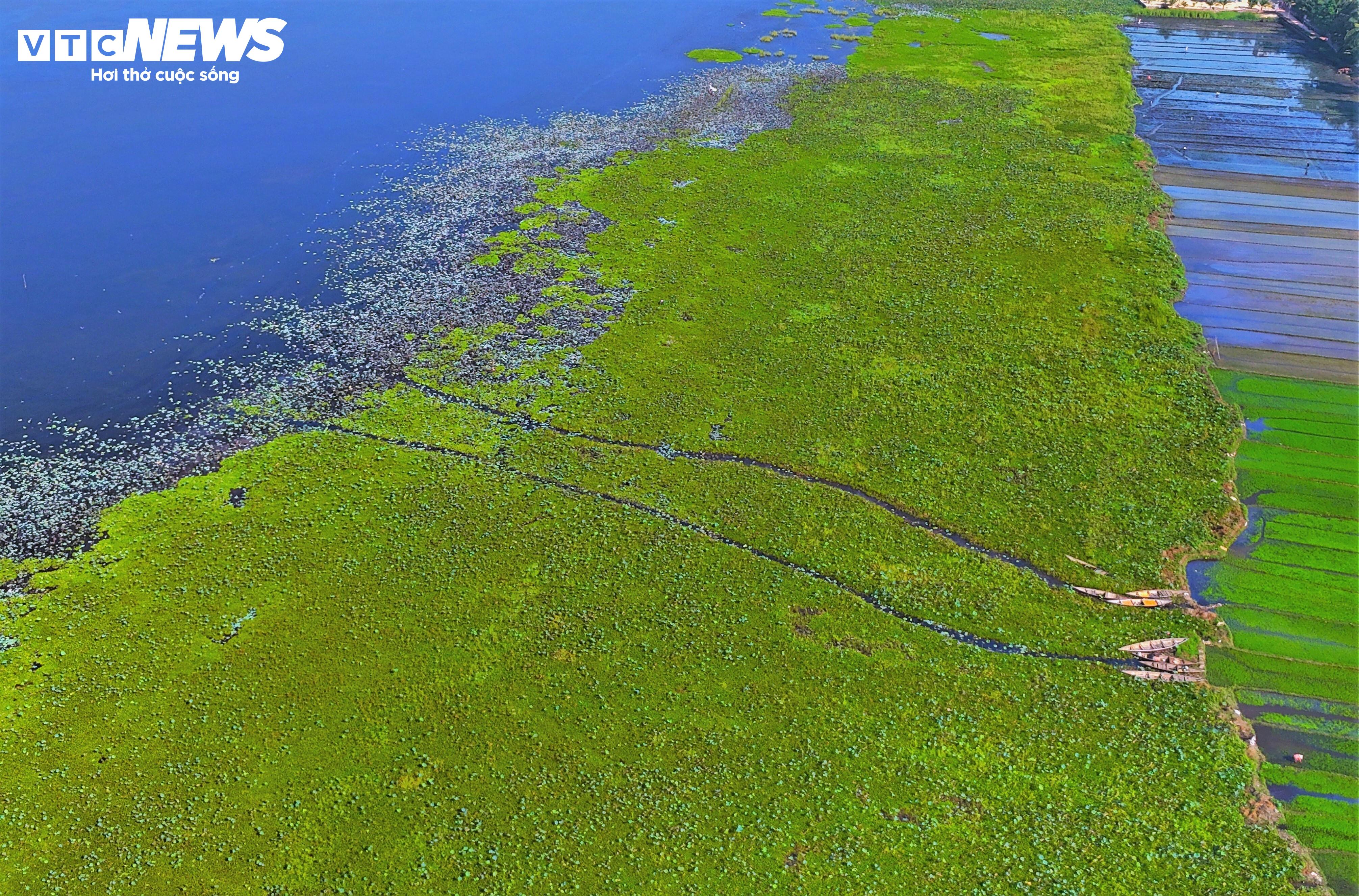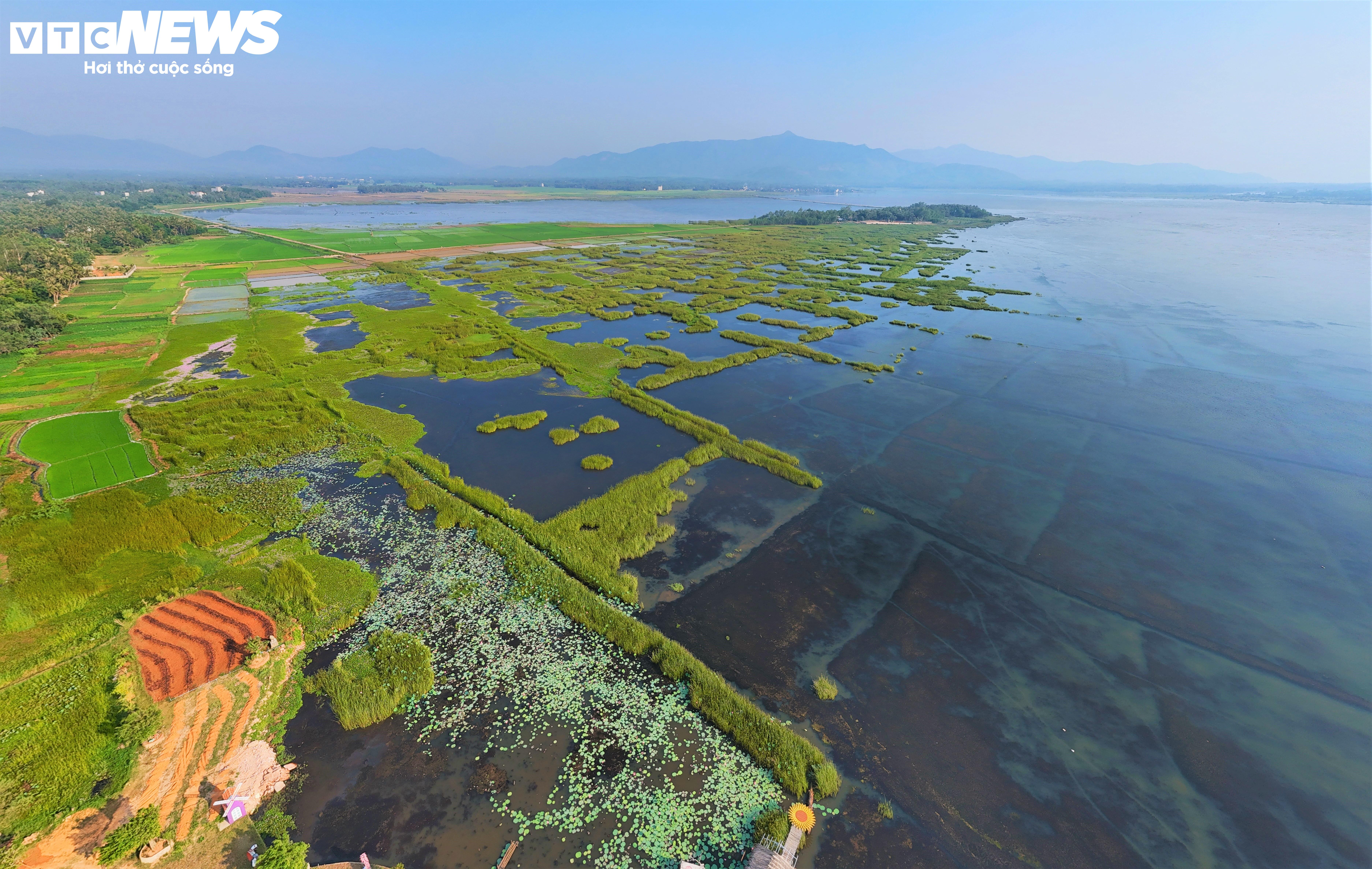 Với chu vi khoảng 20km, đầm Trà Ổ được bao bọc bởi những cánh đồng sen bát ngát. Nhìn từ trên cao, những đầm sen tự nhiên tựa như một thảm lụa xanh mướt trải dài dưới nắng.