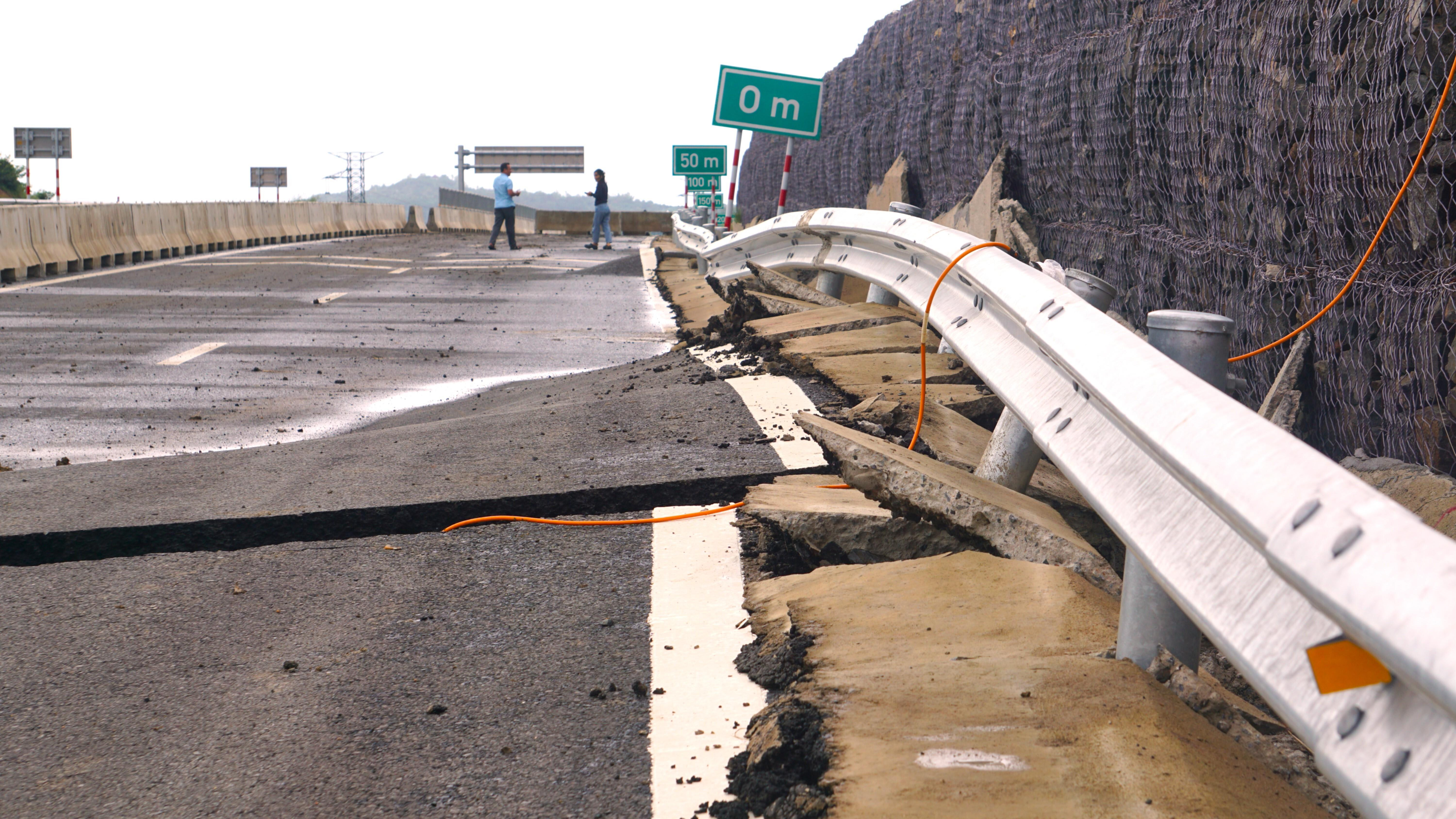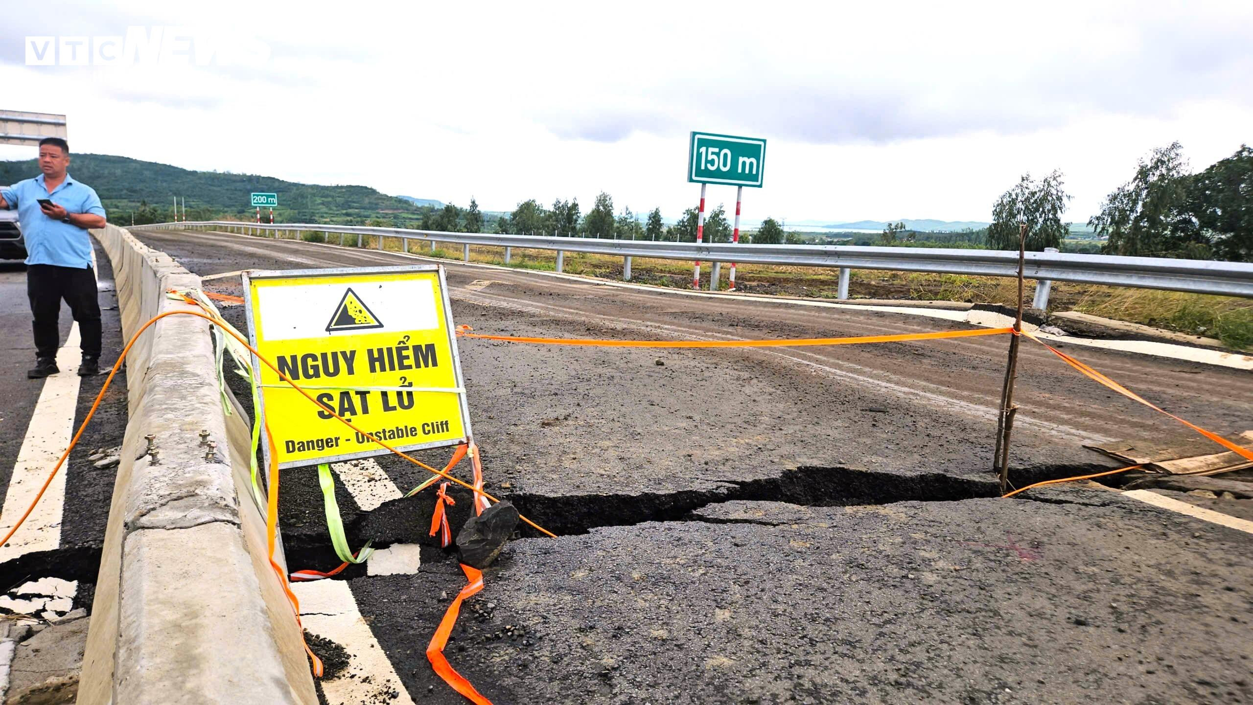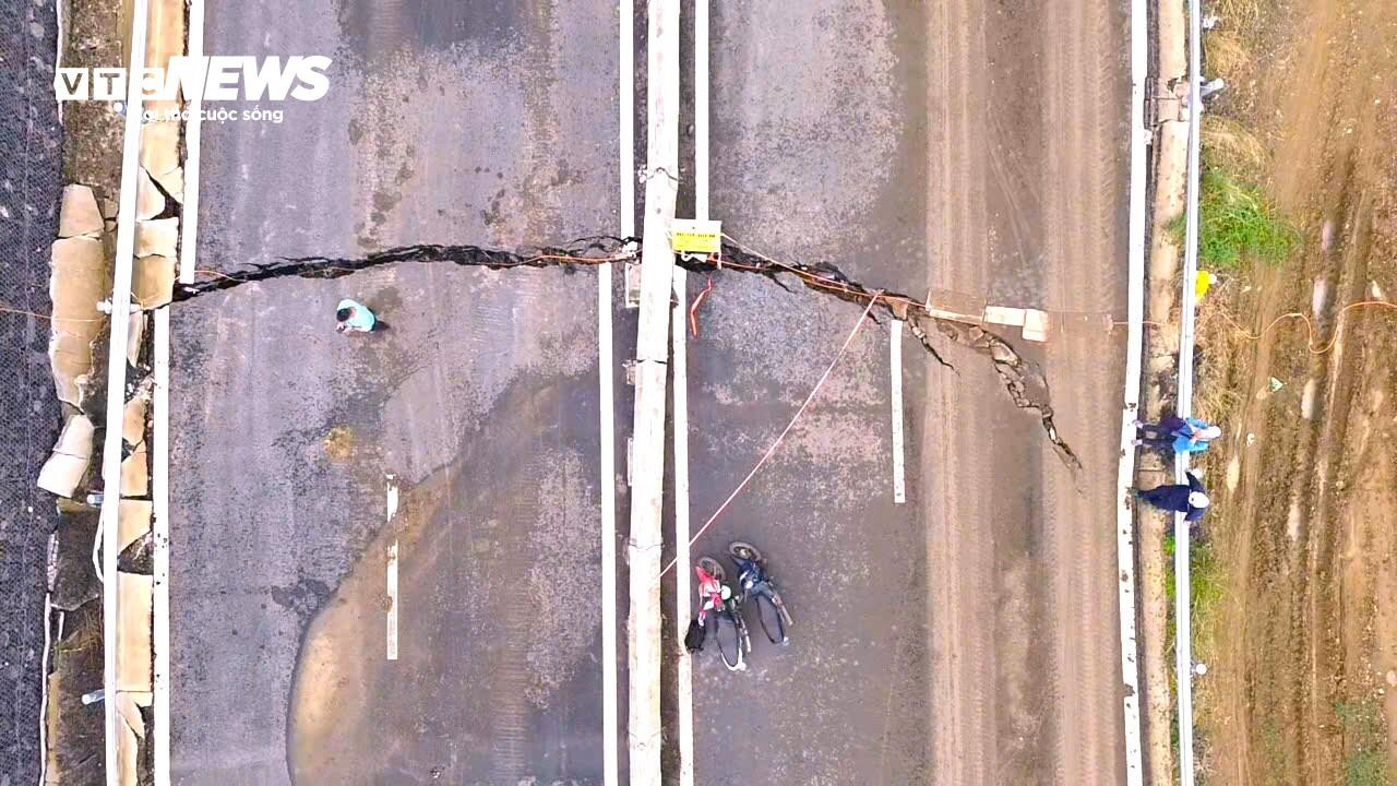 Ghi nhận tại hiện trường cho thấy, mặt đường cao tốc xuất hiện nhiều vết nứt lớn, kéo dài cắt ngang toàn bộ bề rộng tuyến.