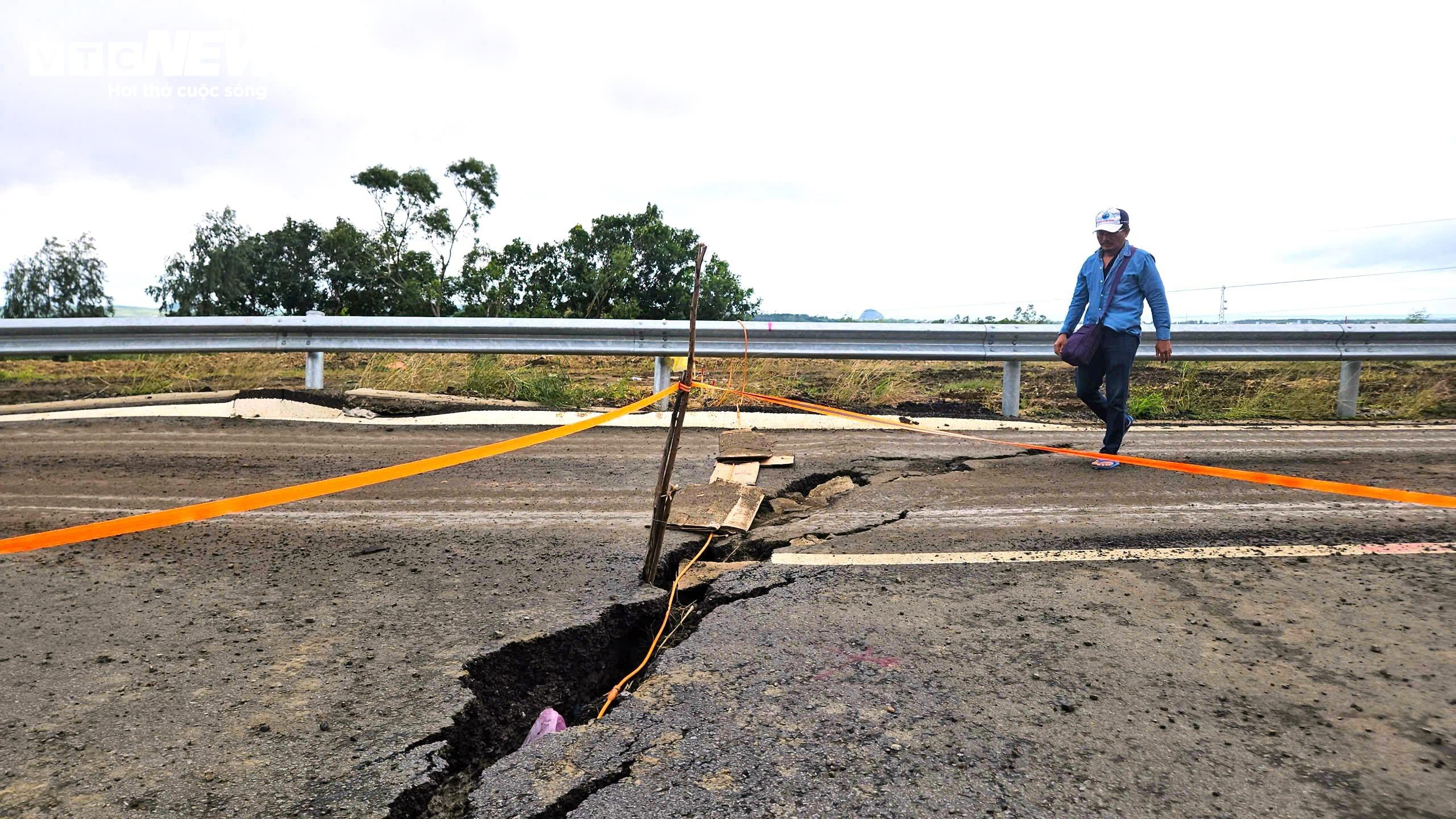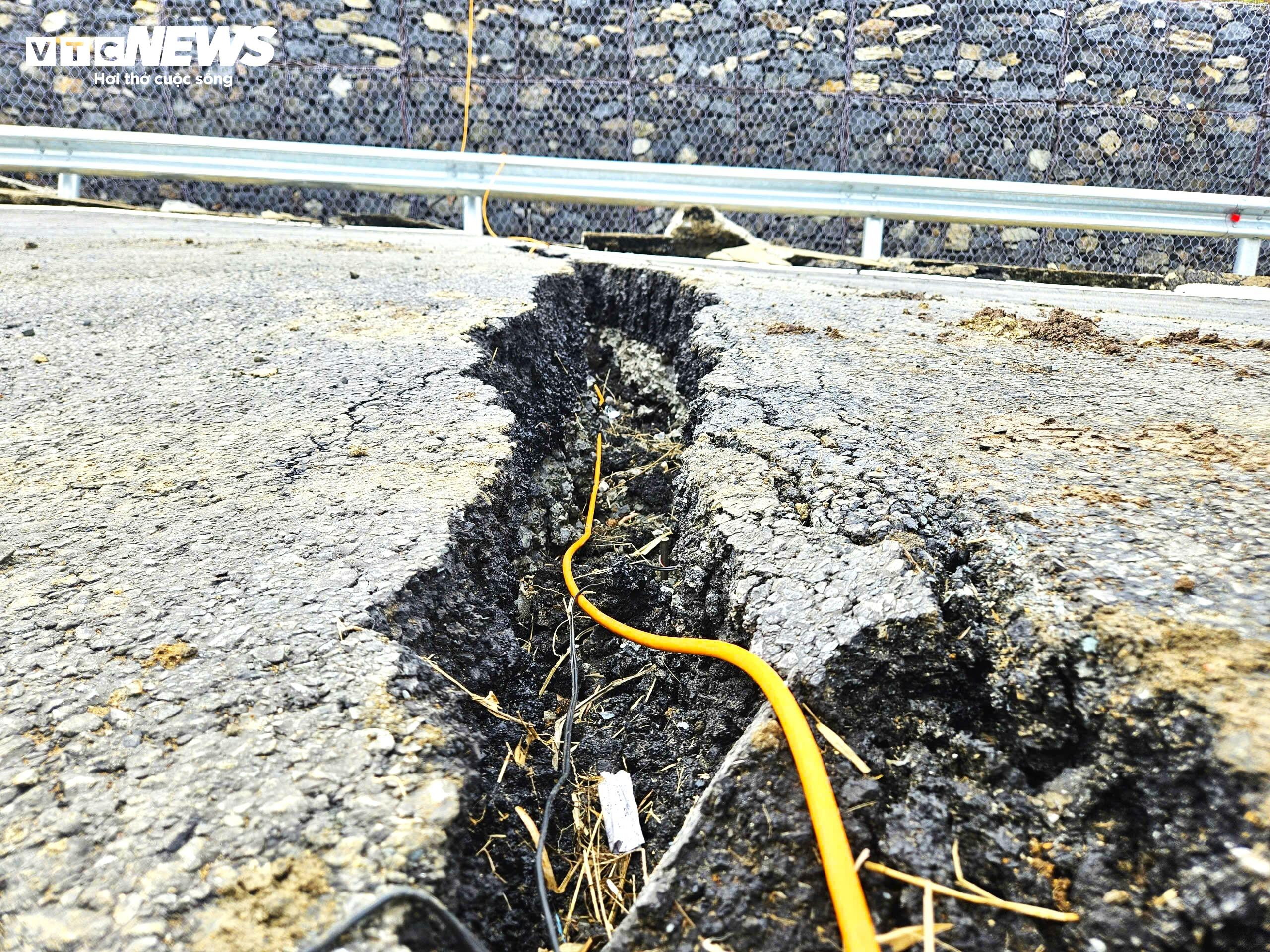 Có vị trí mặt đường bị xé toạc, sụt lún sâu, tạo thành các khe nứt rõ rệt. Lớp bê tông nhựa bong tróc, nền đường phía dưới bị phá vỡ, bùn đất tràn lên mặt đường.