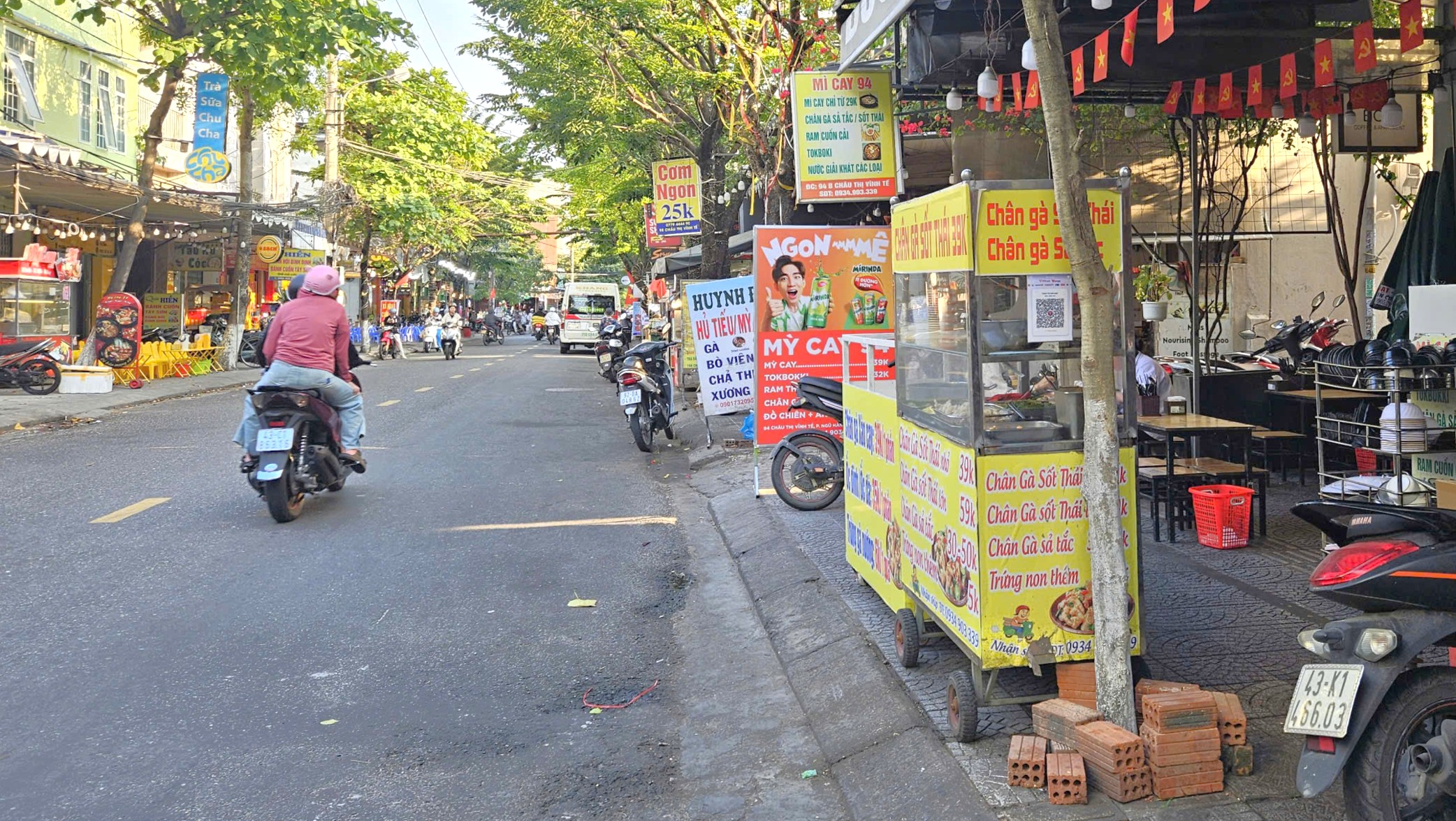 Trên đường Châu Thị Vĩnh Tế (phường Ngũ Hành Sơn), một trong những tuyến đường kinh doanh ẩm thực sầm uất, vỉa hè được tận dụng tối đa để kê bàn ghế, quầy hàng buôn bán. Ảnh: TẤN VIỆT