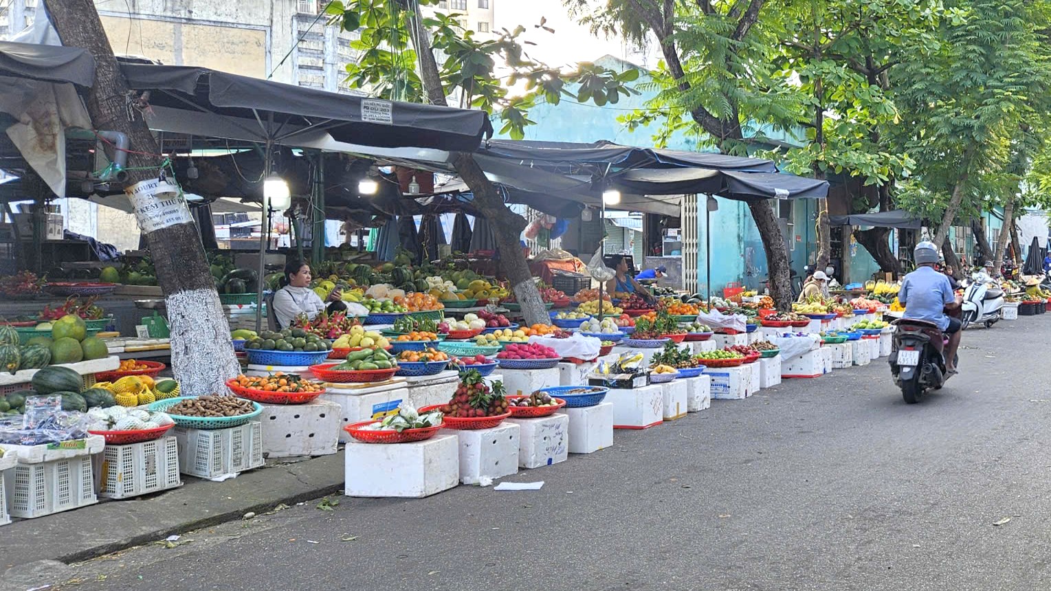 Ở phường Sơn Trà, trên tuyến đường Ngô Trí Hòa, nhiều tiểu thương bày hàng hóa buôn bán tràn cả xuống lòng đường. Thực trạng này đã diễn ra thời gian dài. Ảnh: TẤN VIỆT