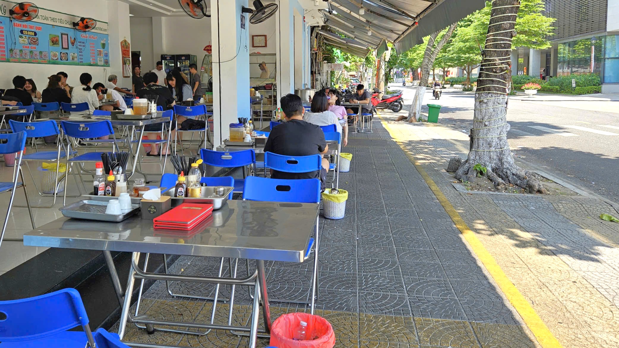 Một quán phở trên đường Lý Tự Trọng (phường Hải Châu) kê bàn ghế ra vỉa hè cho thực khách ngồi. Ảnh: TẤN VIỆT
