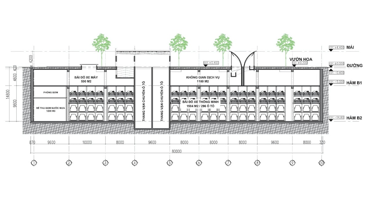 Mặt cắt quy hoạch bãi đỗ xe ngầm tại khu vực vườn hoa Phùng Hưng - Bát Đàn.