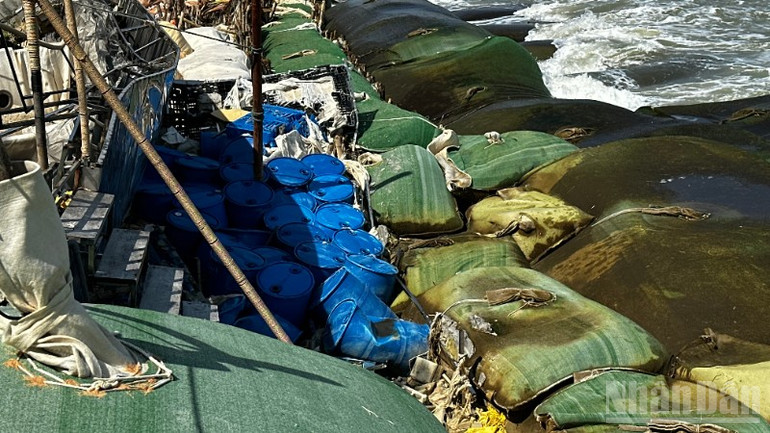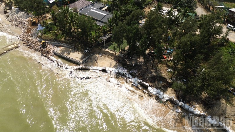 Công trình kè tạm tại khu vực này bị sóng lớn kèm gió mạnh làm hư hỏng bờ kè, một khối lượng cát lớn bị trôi, vệt sạt lở kéo dài khoảng 225m, chiều sâu trung bình từ 5m đến 7m, khoét sâu vào bên trong bờ biển, đe dọa tài sản của người dân sống tại khu vực này và các công trình, hạ tầng.