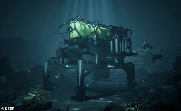 Căn cứ dưới nước được gọi là Vanguard có thiết kế giống một tàu vũ trụ. Được thiết kế để hoạt động ở độ sâu 50m, Vanguard bao gồm một buồng sinh hoạt, một trung tâm lặn và đế nền cố định. Ảnh: Getty Images for DEEP.
