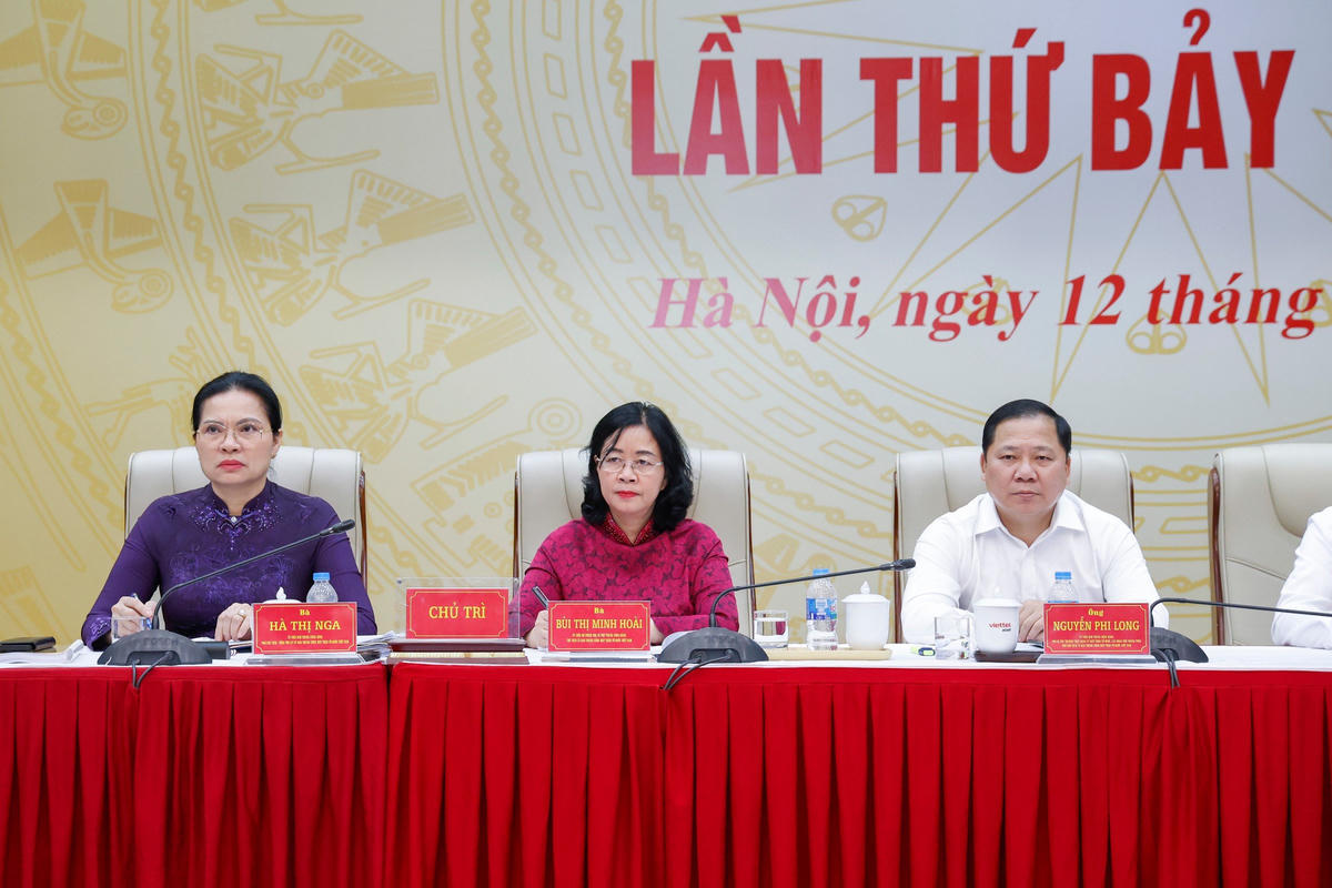 Chủ tịch Bùi Thị Minh Hoài và các đại biểu lắng nghe ý kiến của các vị Ủy viên UBTƯ MTTQ Việt Nam tại Hội nghị. Ảnh: Quang Vinh.