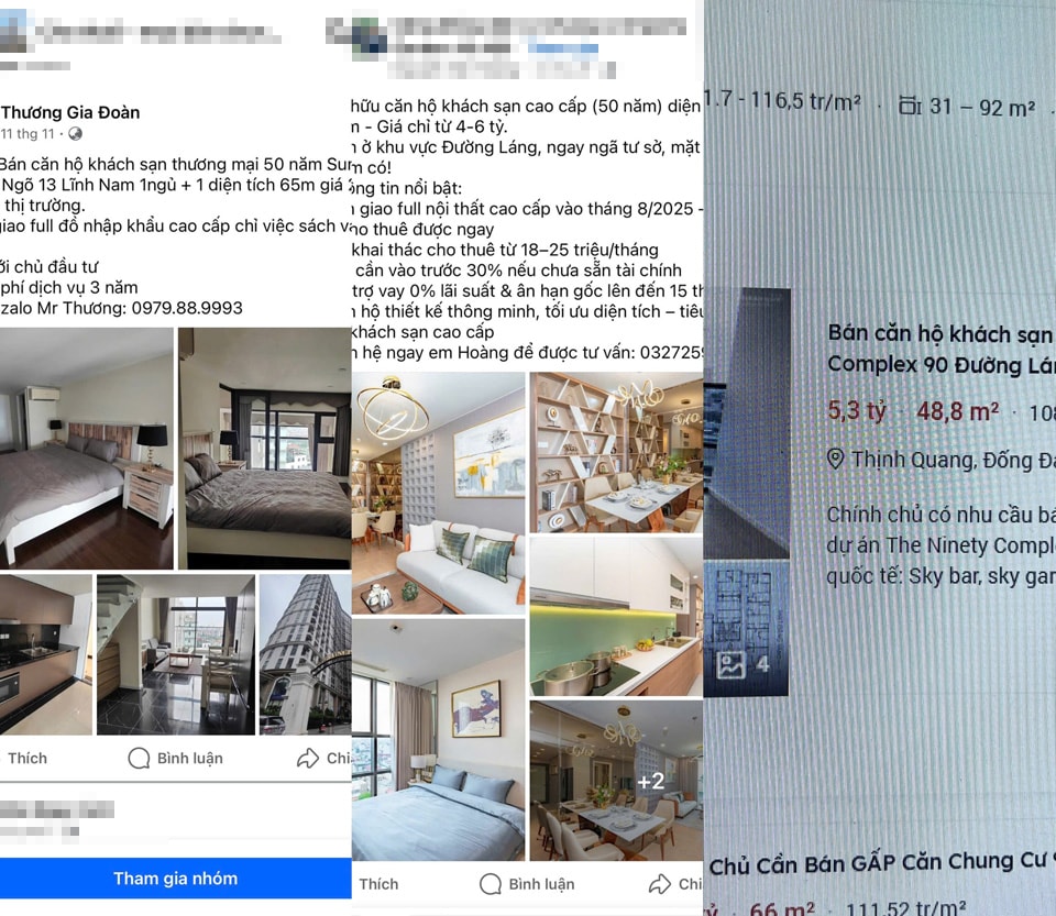 Chẳng hạn, trên trang batdongsan.com, căn hộ khách sạn 5 sao tại đường Trần Duy Hưng (phường Cầu Giấy) có giá 5,5 tỷ đồng cho 48,8m²; căn hộ khách sạn cao cấp 50 năm tại đường Láng có diện tích 38-50m² được rao 4-6 tỷ đồng, khai thác cho thuê 18-25 triệu đồng/tháng. Một người môi giới bất động sản có số điện thoại 032725… khẳng định với phóng viên, đây là căn hộ xây trên đất thương mại - dịch vụ, thời hạn 50 năm, giá 100-110 triệu đồng/m², "mềm" hơn thị trường.