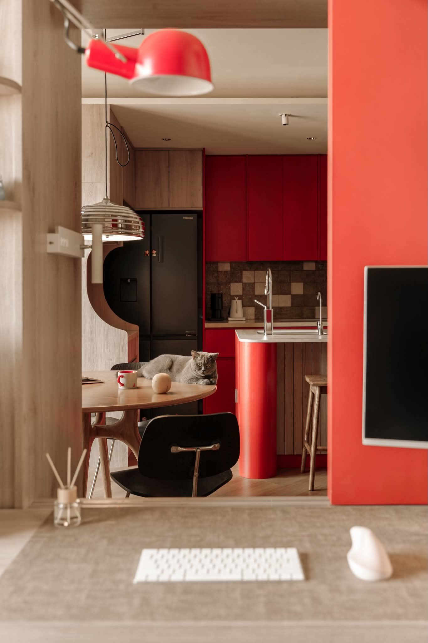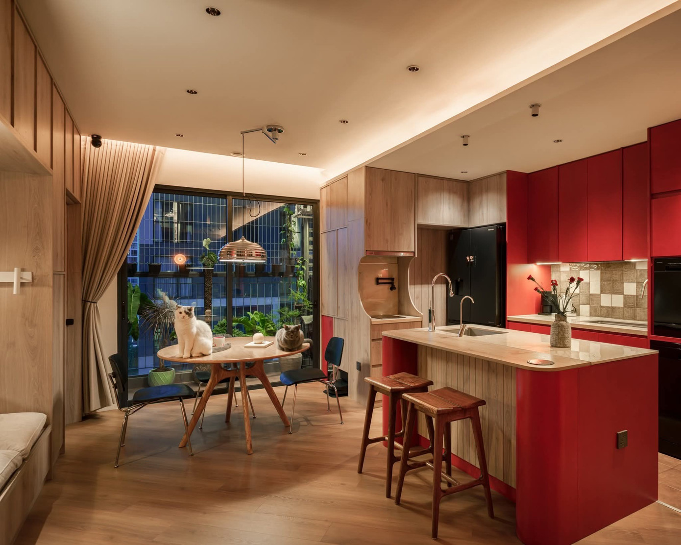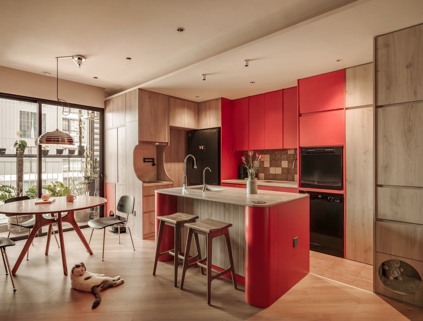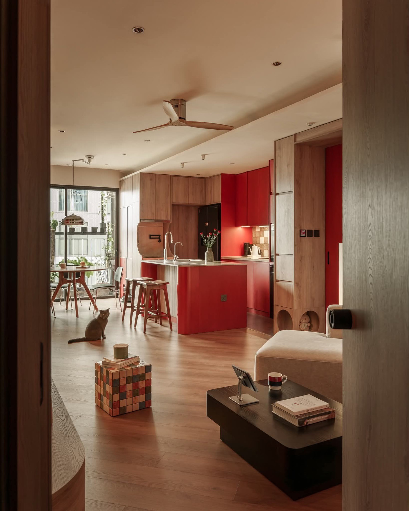 Sắc đỏ nổi bật kết hợp cùng gỗ sáng và ánh sáng tự nhiên chan hòa, tạo nên không gian sống đầy nhịp điệu, trẻ trung nhưng vẫn ấm áp.