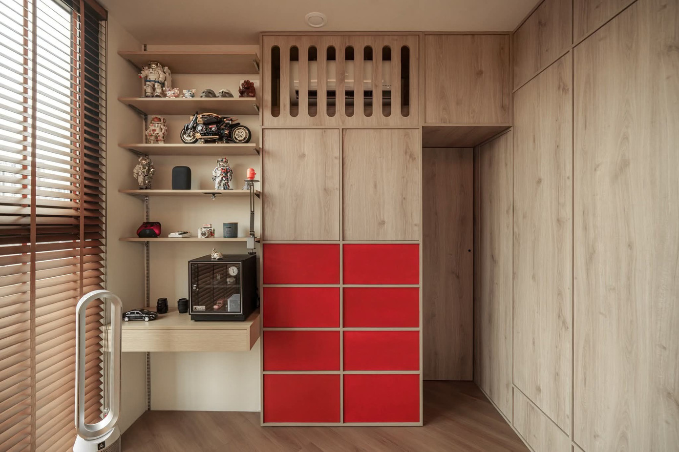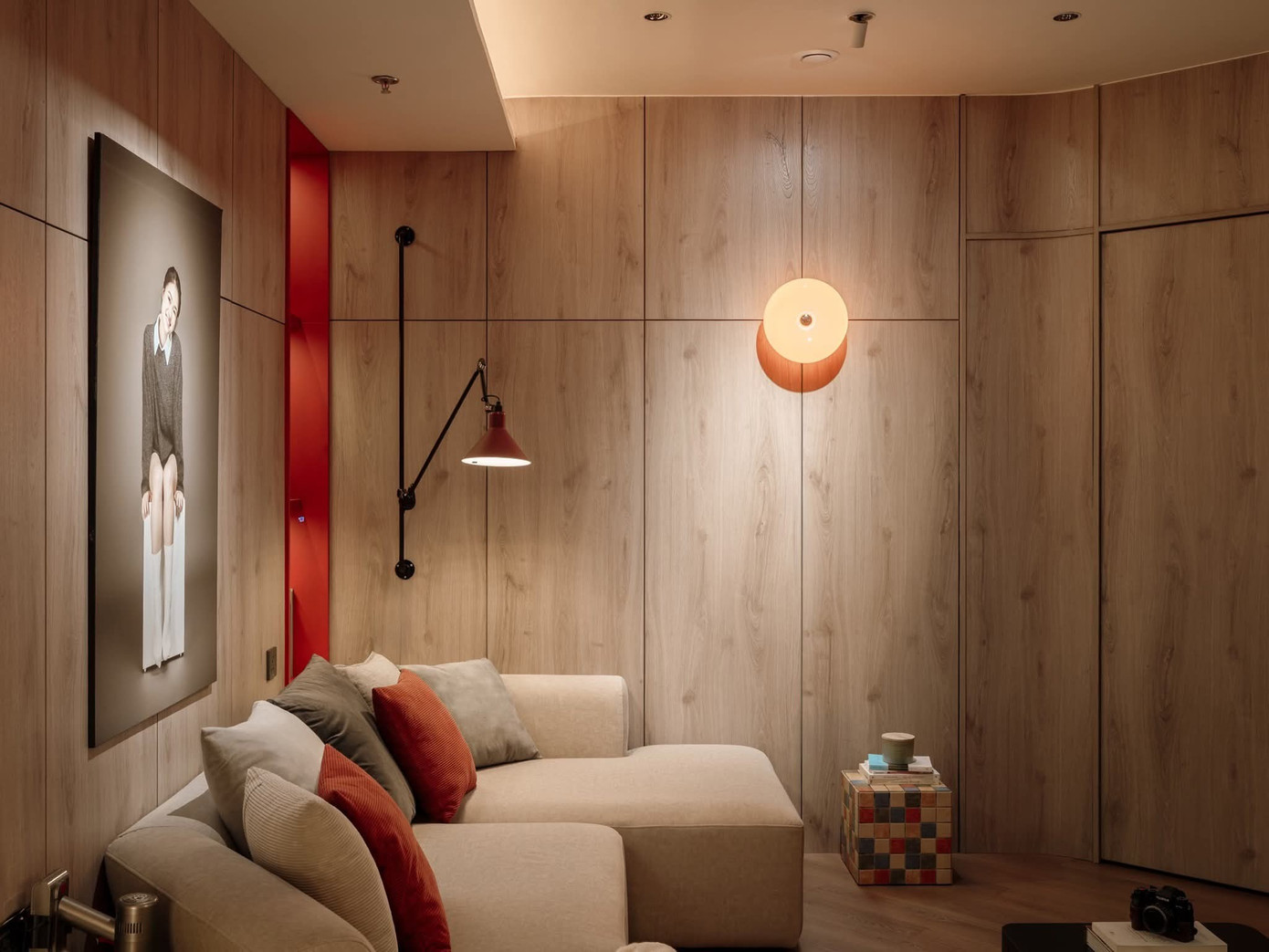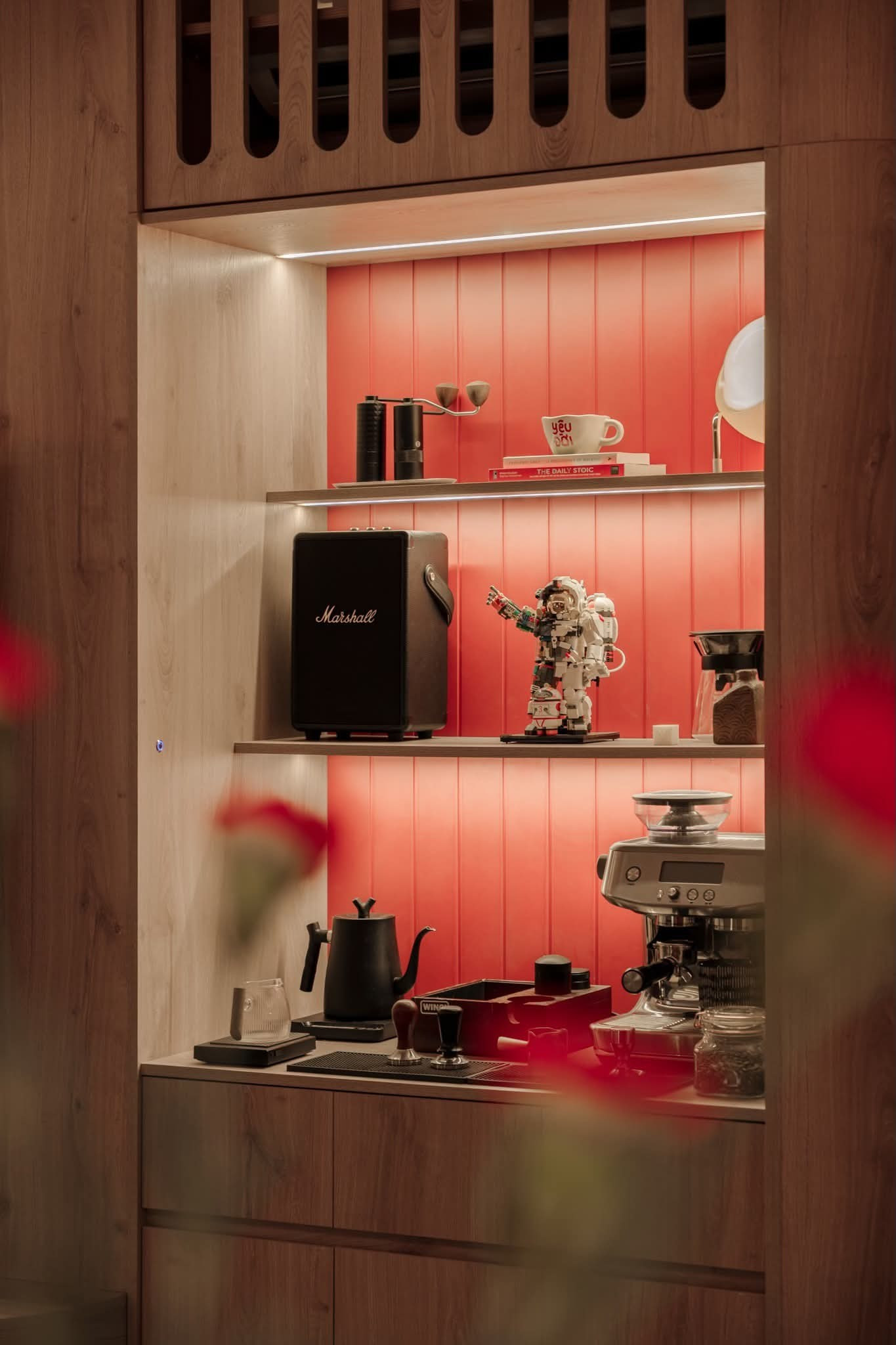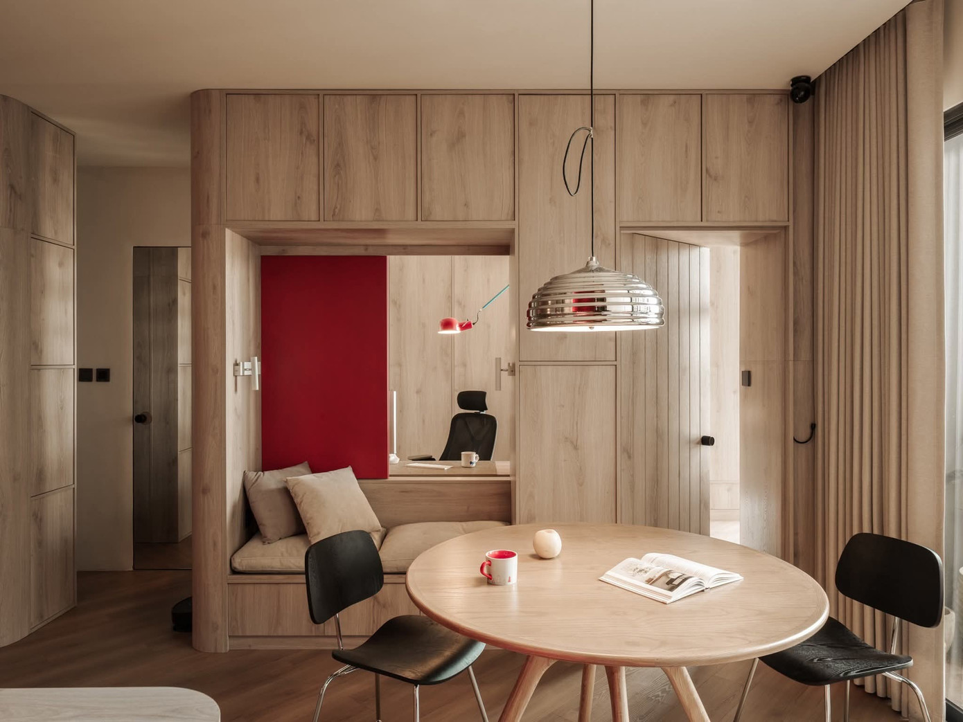 Sắc đỏ nổi bật kết hợp cùng gỗ sáng và ánh sáng tự nhiên chan hòa, tạo nên không gian sống đầy nhịp điệu, trẻ trung nhưng vẫn ấm áp.