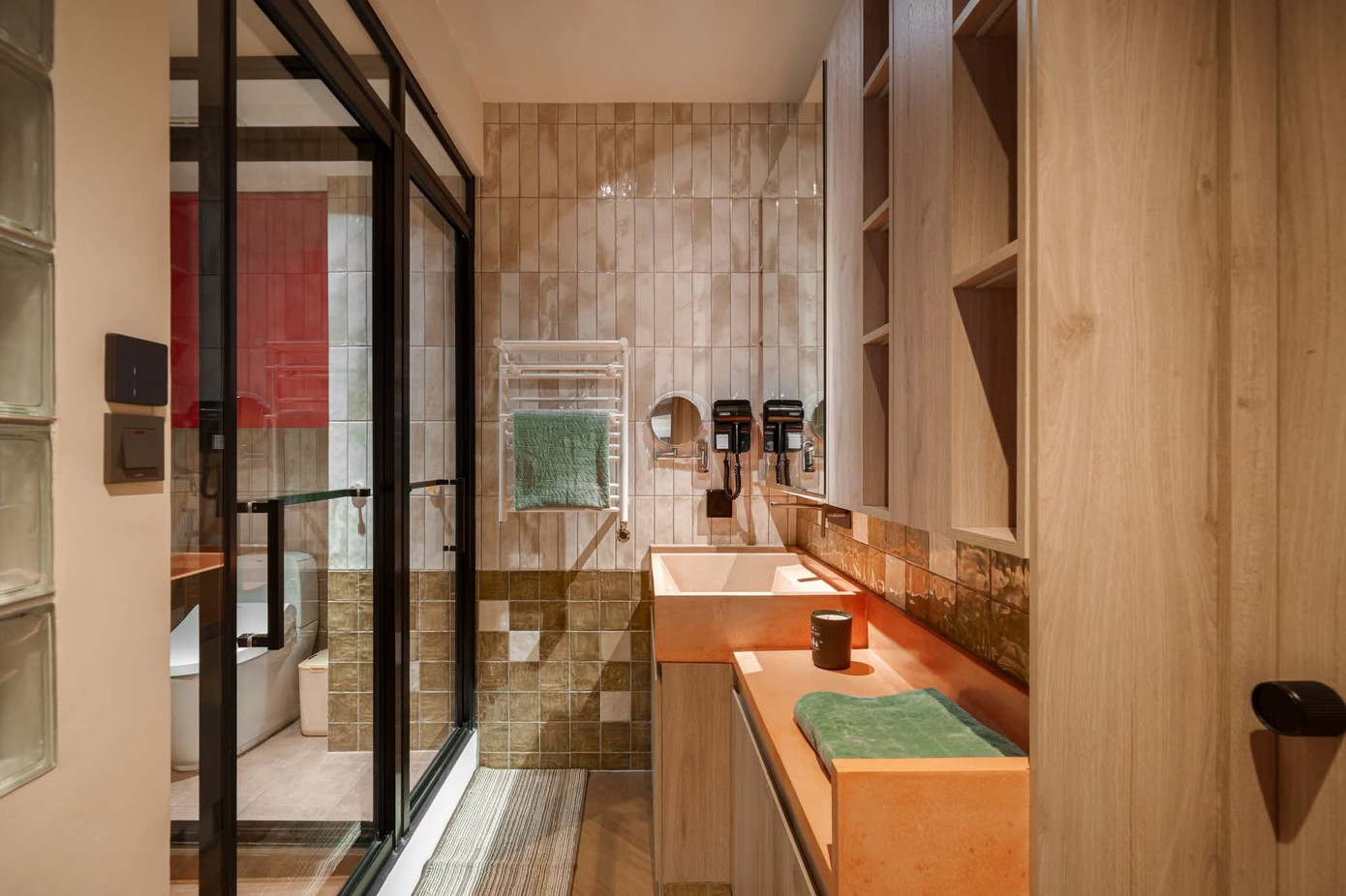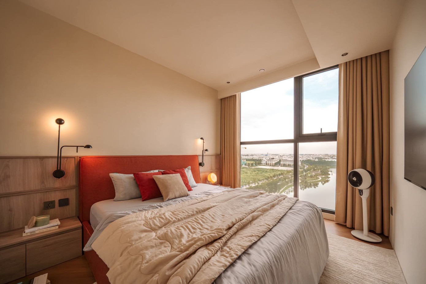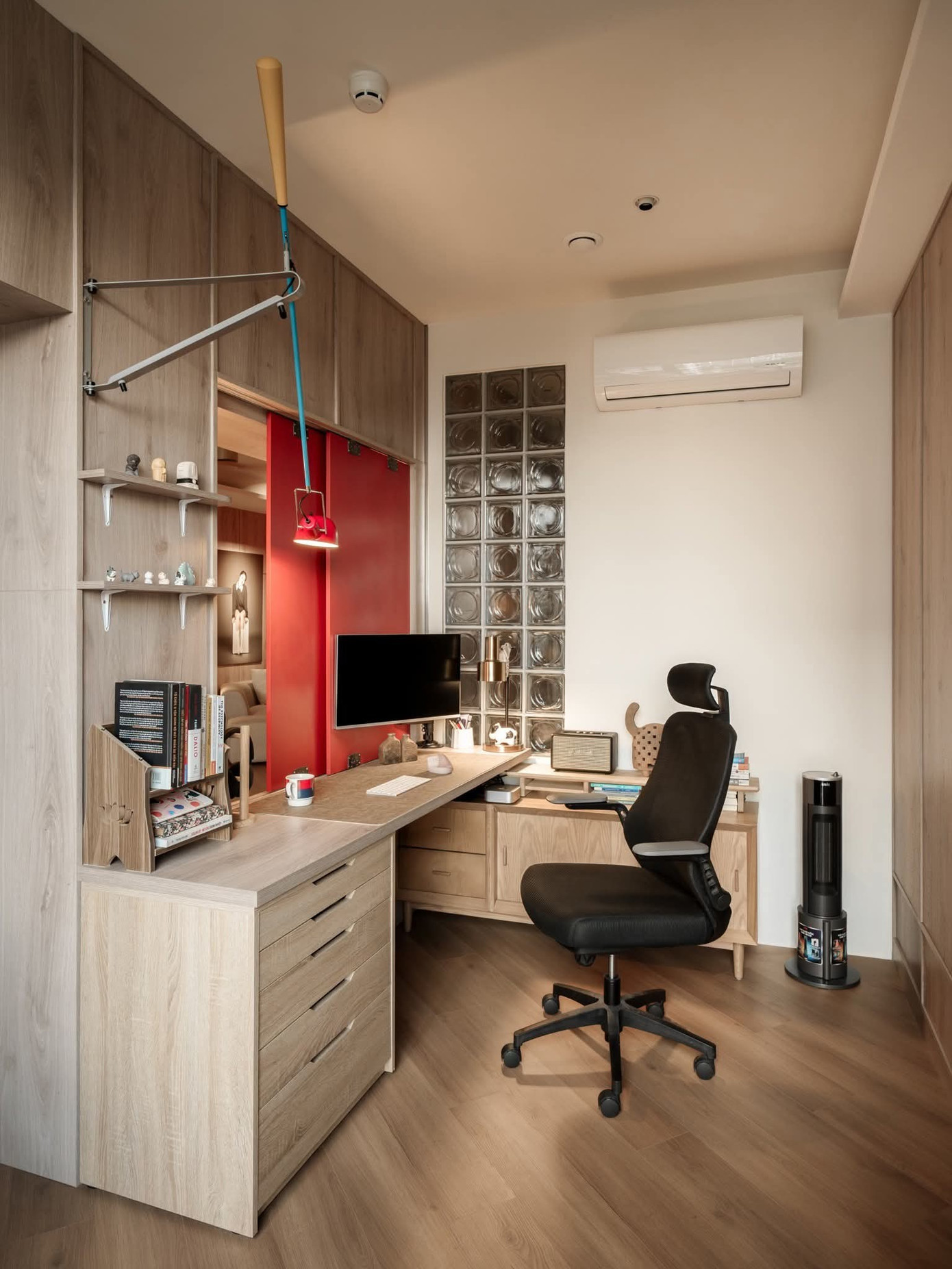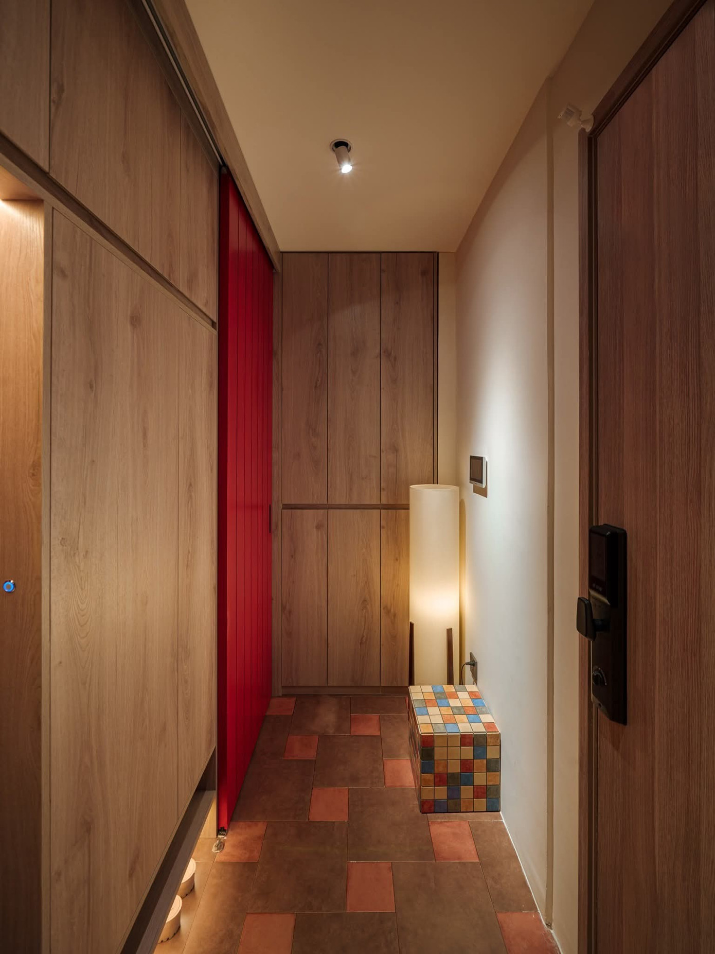 Sắc đỏ nổi bật kết hợp cùng gỗ sáng và ánh sáng tự nhiên chan hòa, tạo nên không gian sống đầy nhịp điệu, trẻ trung nhưng vẫn ấm áp.
