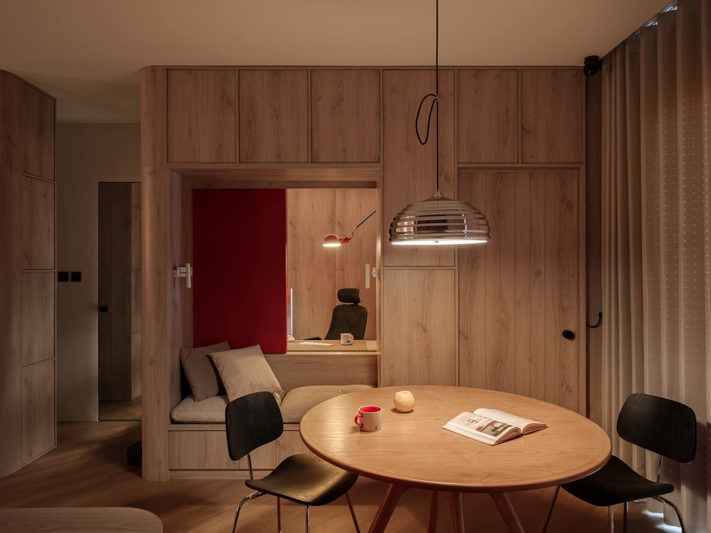 Từ không gian khách bếp đến phòng ngủ và phòng làm việc, màu đỏ và gỗ đều xuất hiện xuyên suốt và đồng bộ.
