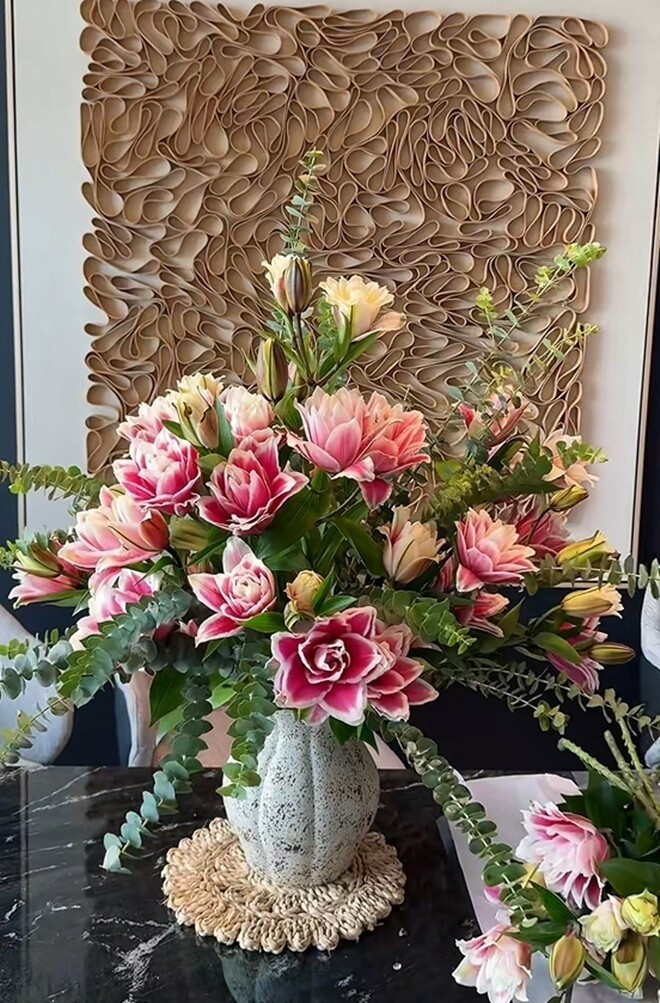 Bình hoa ly chiếm trọn spotlight trên chiếc bàn vân đá. Ảnh: FBNV