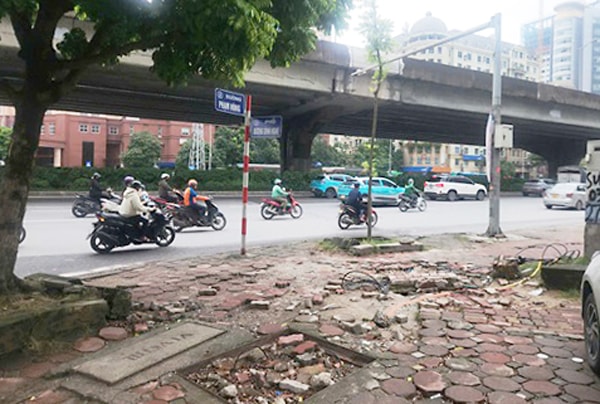 Điển hình của sự xuống cấp có thể kể đến vỉa hè trên đường Phạm Hùng (thuộc các phường Cầu Giấy, Yên Hòa và Từ Liêm). Tại đây, nhiều đoạn vỉa hè bị trũng sâu từ 5-15cm, tạo thành những hố nước lớn sau mưa. Việc đi lại của người dân trở nên khó khăn, nhất là vào giờ cao điểm hoặc sau những cơn mưa lớn. Anh Nguyễn Văn Hùng, sống gần Bến xe Mỹ Đình (phường Từ Liêm), cho biết mỗi lần đưa đón con đi học về, anh đều cảm thấy bất an khi đi bộ trên đoạn vỉa hè này. “Nhiều đoạn vỉa hè có hố sụt lún sâu, gạch bật lên từng mảng, đi rất dễ vấp ngã. Tôi buộc phải đi xuống lòng đường cho dù biết rằng rất nguy hiểm”, anh Hùng chia sẻ.