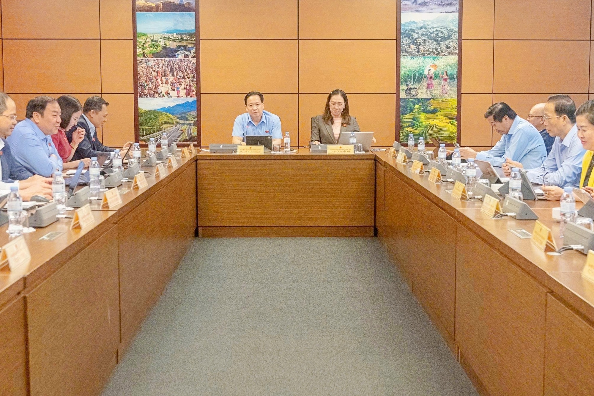 Các đại biểu Quốc hội tỉnh Sơn La và Vĩnh Long thảo luận tổ. Ảnh: Mạnh Hưng