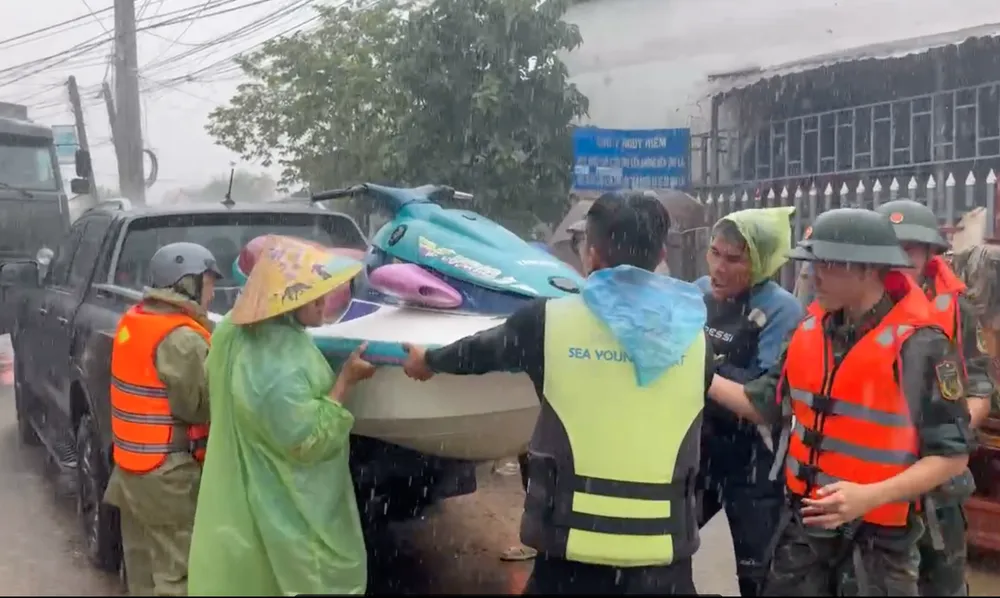 Phóng viên Pháp Luật TP.HCM đi tác nghiệp vùng lũ, đồng thời hỗ trợ các lực lượng cứu hộ tại địa phương. Ảnh: VT-PH