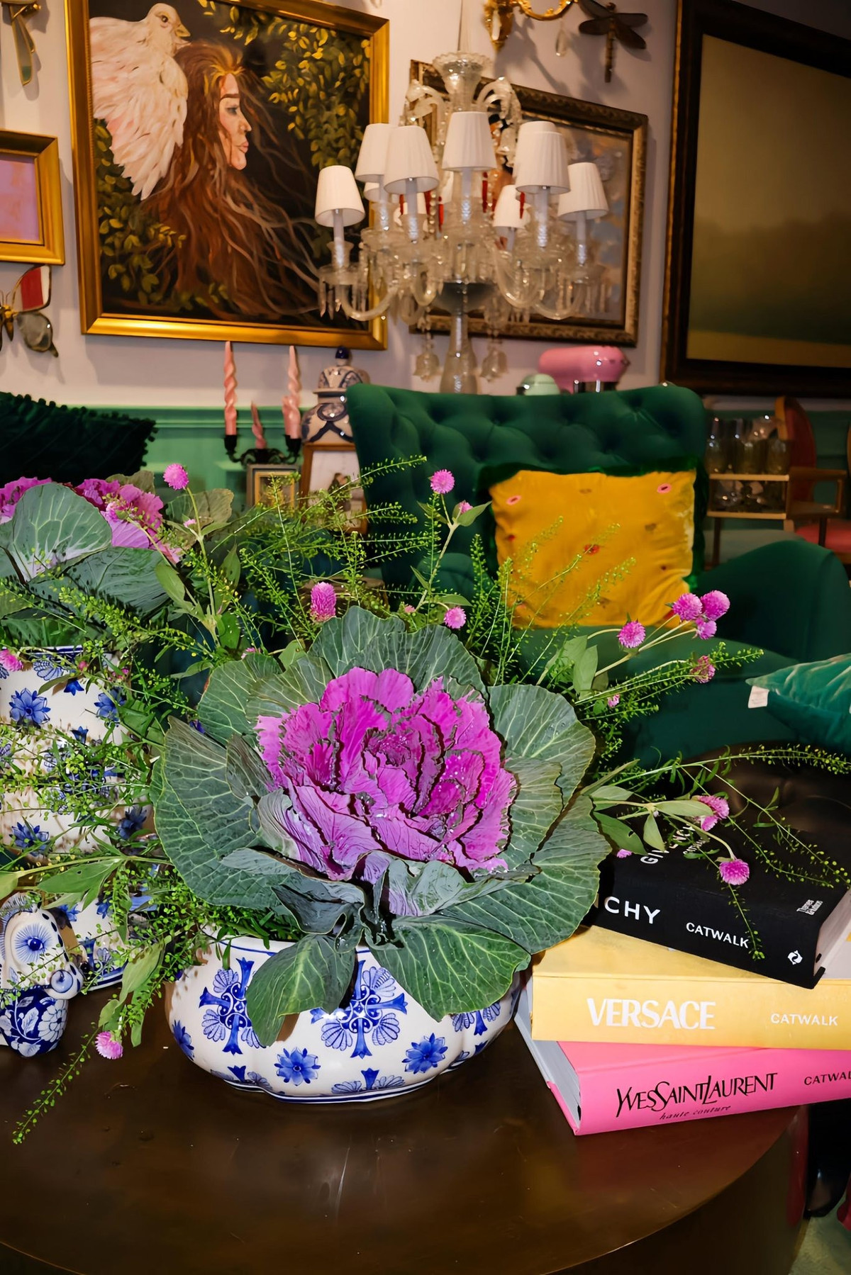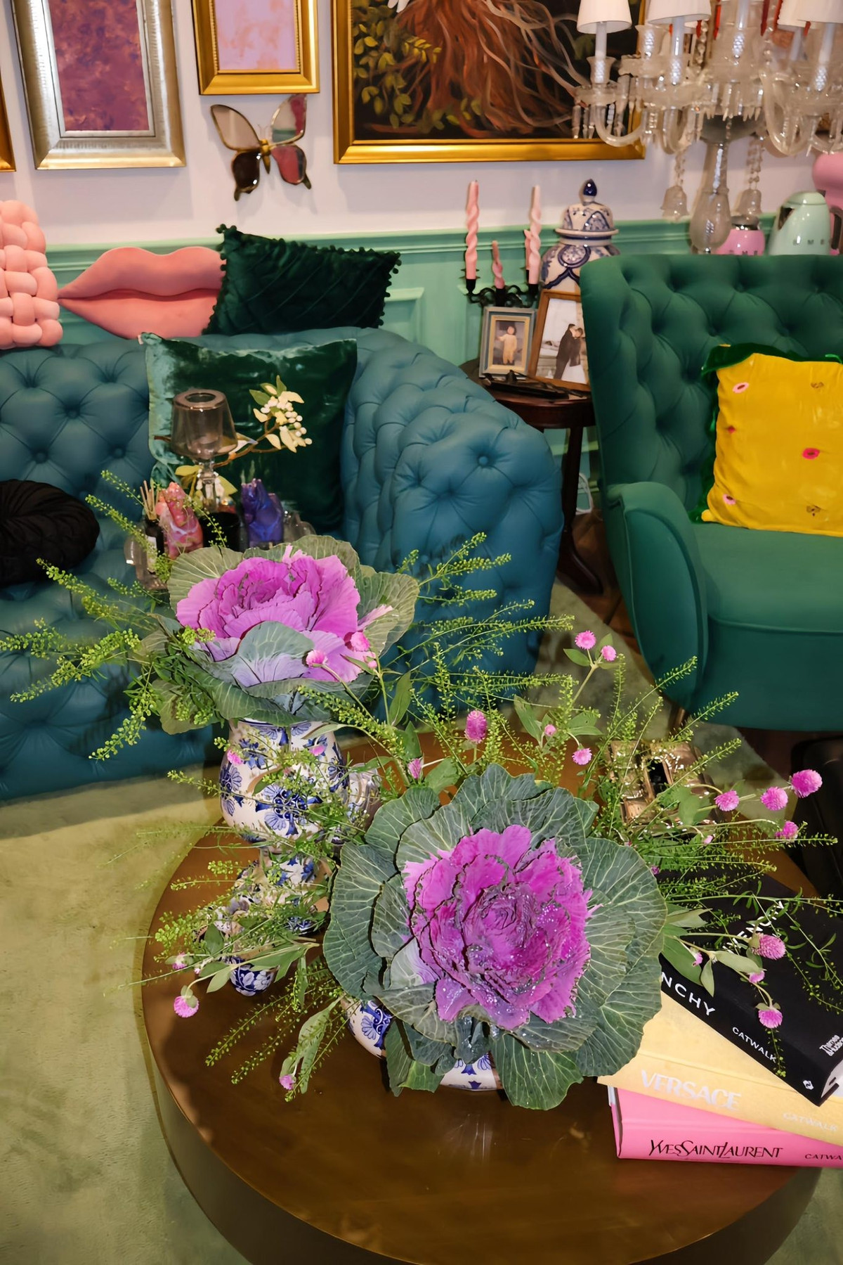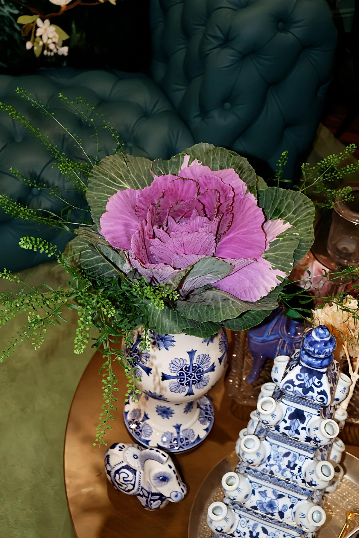 Cơ ngơi của Hoa hậu Phan Hoàng Thu nằm gần hồ Tây. Bắp cải tím được phối cùng hoa cúc bách nhật và lá xanh. Ảnh: FBNV