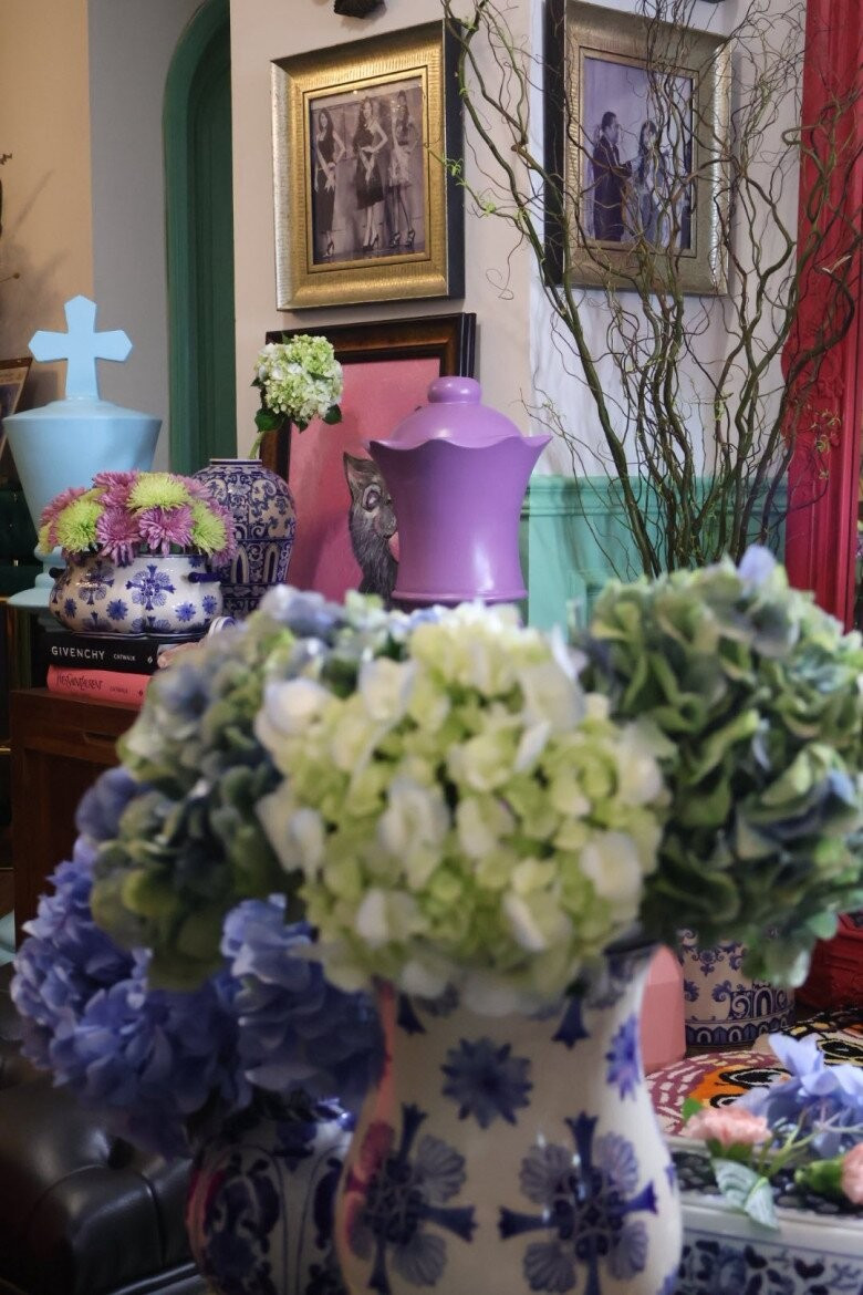 Bình hoa cẩm tú cầu màu xanh lơ nổi bật trên nền tường và tranh màu pastel. Ảnh: FBNV