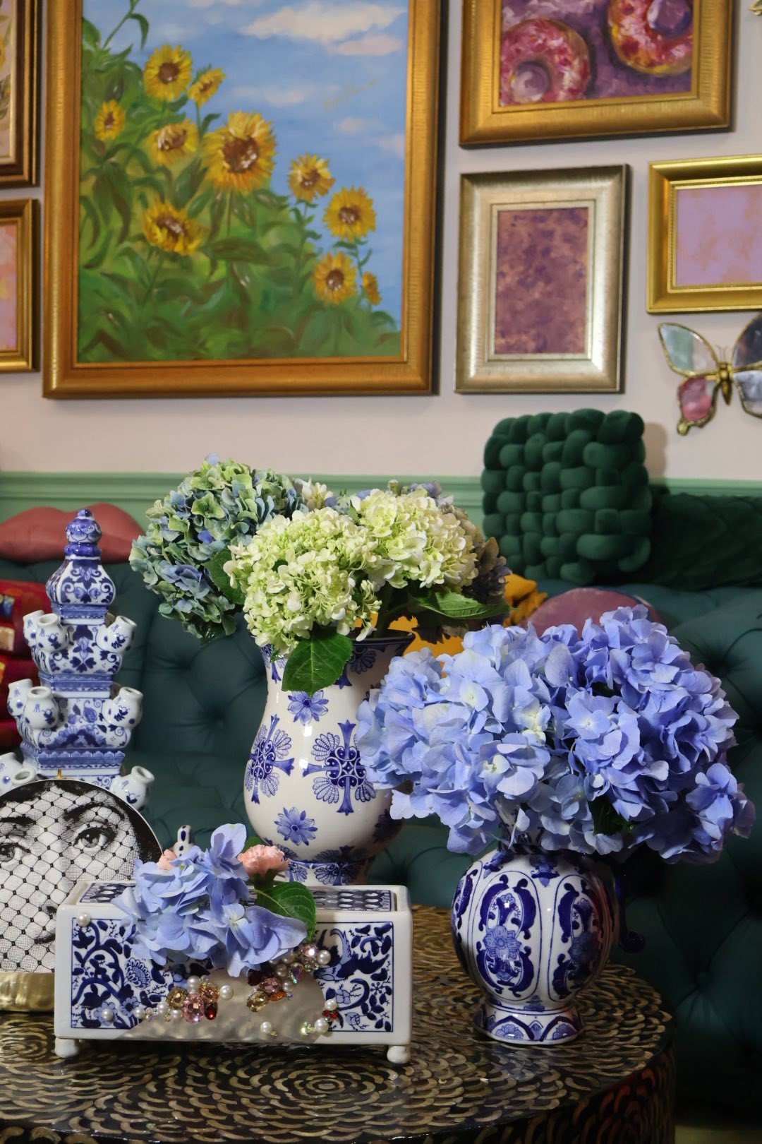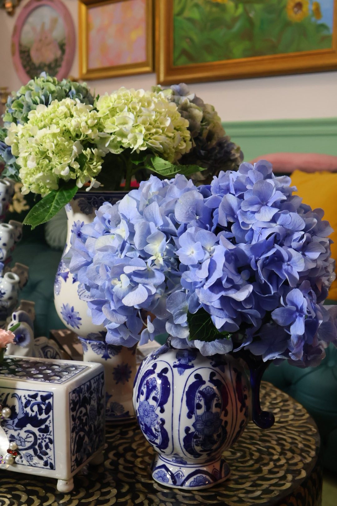 Trước đó, Phan Hoàng Thu khoe góc nhà rực rỡ với bình hoa cẩm tú cầu xanh và trắng, kết hợp gốm lam. Ảnh: FBNV