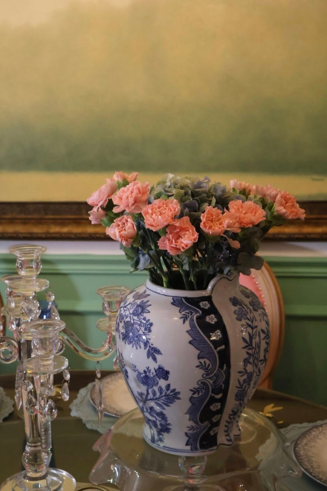 Hoa cẩm chướng màu hồng pastel xen lẫn lá xanh nhẹ nhàng, đặt trong bình gốm họa tiết đối xứng cổ điển. Ảnh: FBNV