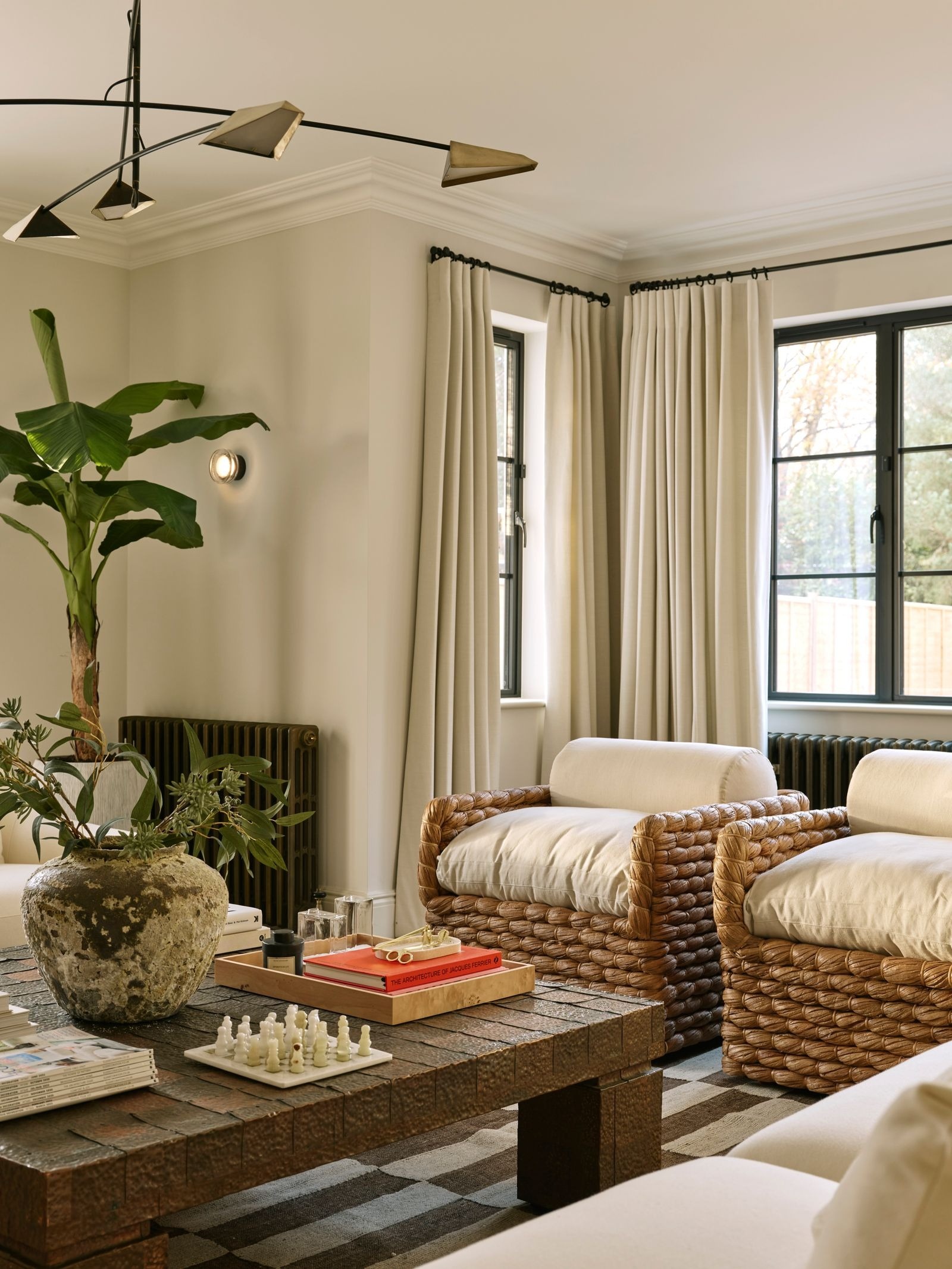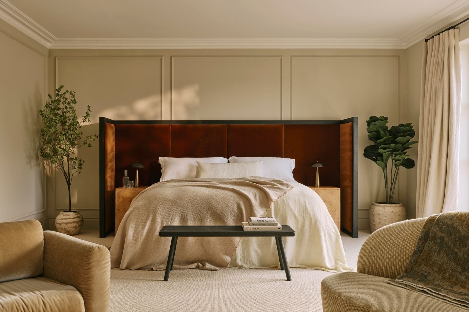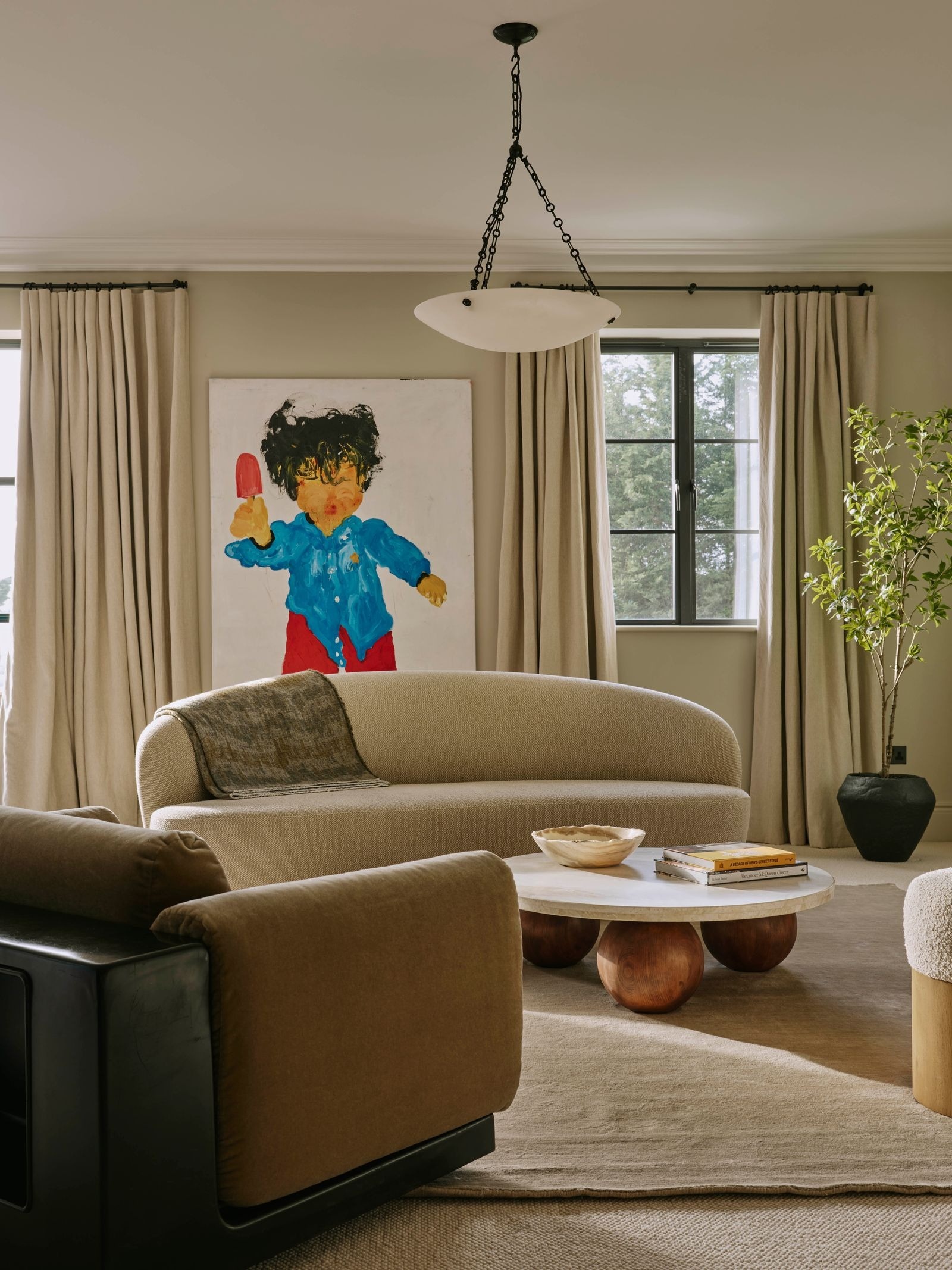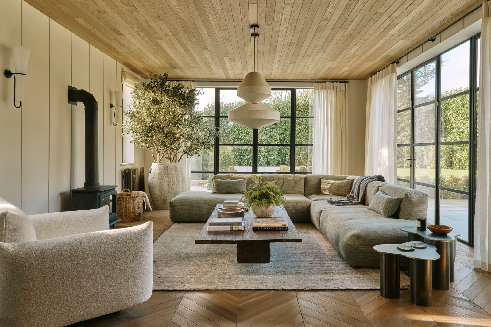 Không chỉ đáp ứng thẩm mỹ mong muốn, căn nhà còn được thiết kế để “lớn lên cùng chủ nhân”. “Chúng tôi muốn tạo nên một hành trình vừa có yếu tố gia đình, vừa có không gian để chiêu đãi bạn bè”, Stone chia sẻ. Ở tầng trệt, phòng khách với cửa sổ cao sát trần và ghế sofa thấp tạo không gian thư giãn nhìn ra vườn. Căn phòng mà Chilwell gọi là “Christmas Room”, nơi cả nhà mở quà mỗi dịp lễ, được phủ trong tông kem dịu và ánh sáng ấm. Những phòng ngủ dành cho khách đều theo bảng màu trung tính, phối cùng sàn gỗ xương cá, tạo cảm giác đồng điệu và thanh thoát.