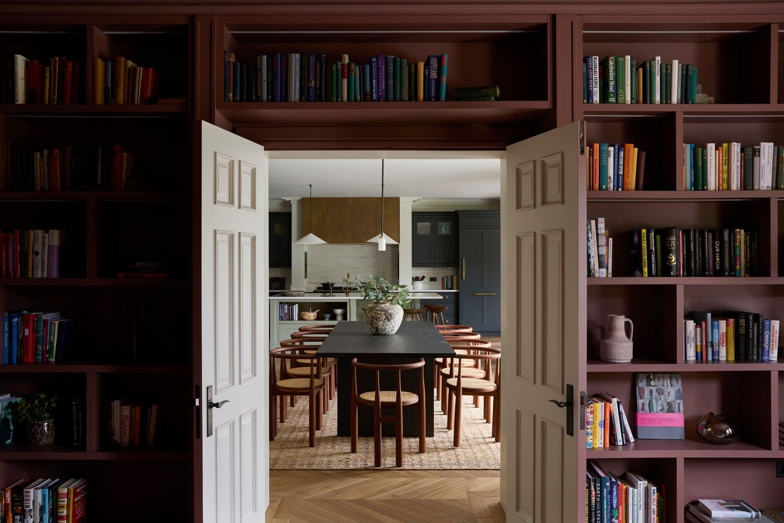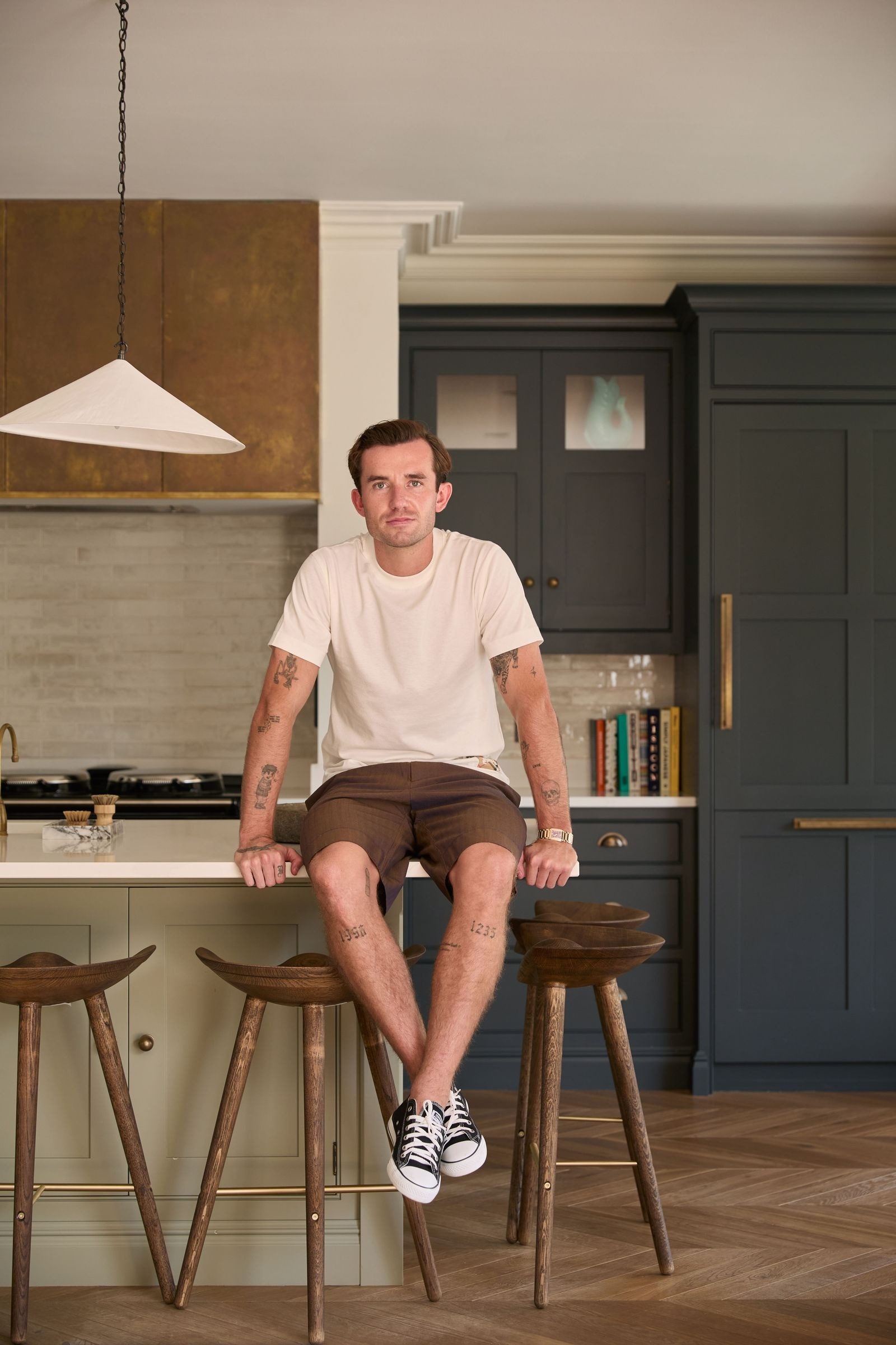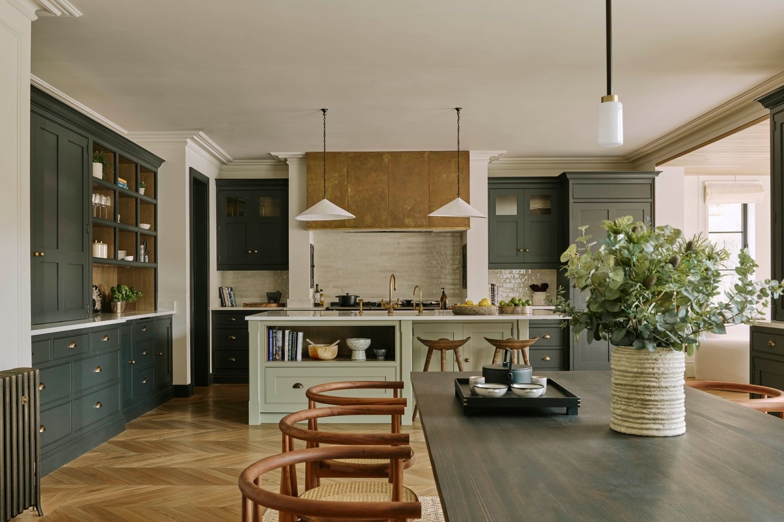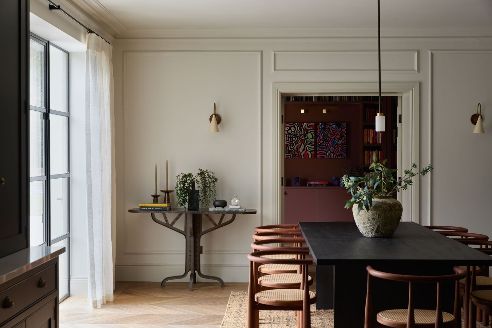 Bếp là khu vực Chilwell dành nhiều tâm huyết nhất. Tông xanh lá dịu mắt, tủ bếp của Tom Howley, bàn ăn dài của Heerenhuis, ghế mây Pháp từ New Works và đèn thả Bert Frank tạo nên không gian vừa hiện đại vừa thân mật. “Tôi muốn bàn ăn đặt ngay trong bếp thay vì tách riêng để việc ăn uống diễn ra thoải mái hơn”, anh giải thích.