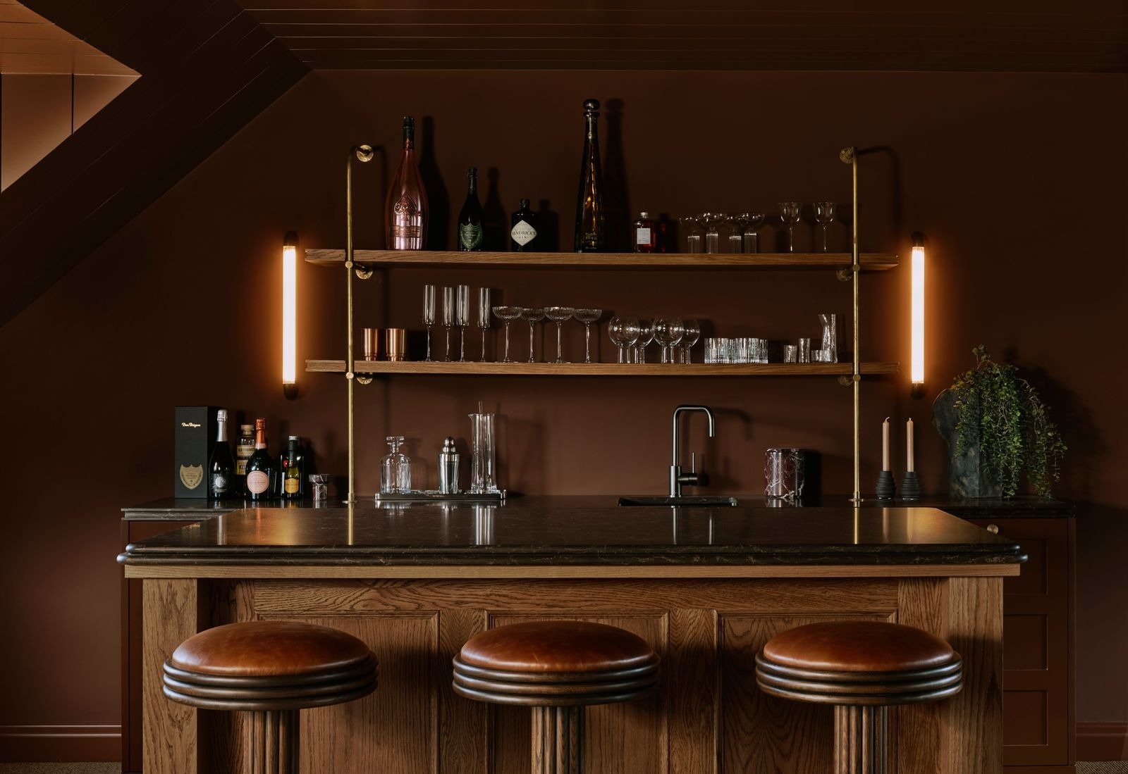 Ở góc nhà khác, phòng chiếu phim với sắc đỏ oxblood đậm được xem là “thiên đường riêng” của Chilwell. “Từ nhỏ tôi đã mê xem phim, mẹ từng nghĩ tôi sẽ theo nghệ thuật biểu diễn”, anh kể. Ghế sofa corduroy mềm mại có thể linh hoạt sắp xếp, quầy bar riêng với gỗ ấm màu tạo cảm giác thư giãn.