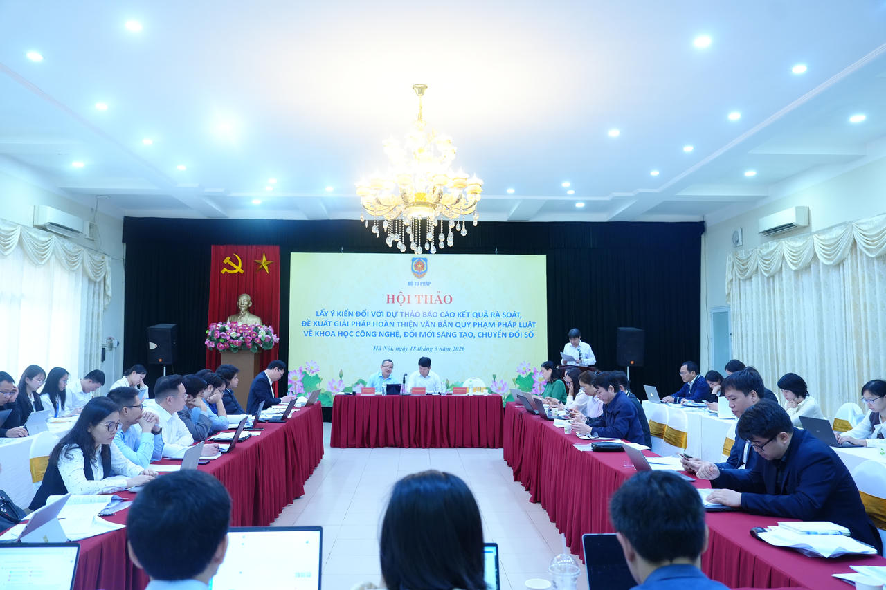 Ngày 18/3, Bộ Tư pháp tổ chức Hội thảo Lấy ý kiến đối với dự thảo Báo cáo Kết quả rà soát, đề xuất giải pháp hoàn thiện văn bản quy phạm pháp luật về khoa học công nghệ (KHCN), đổi mới sáng tạo (KHCN), chuyển đổi số (CĐS).