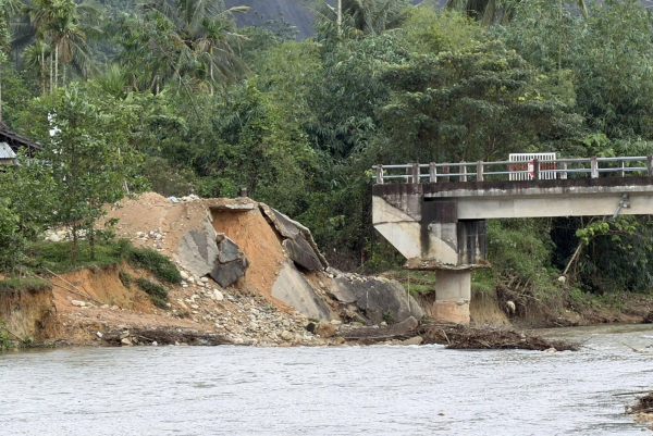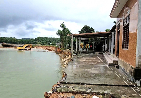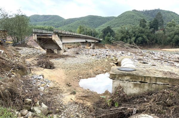 Điểm sạt lở ở đầu cầu Đa Phú bắc qua sông Tả Trạch (xã Khe Tre) gây chia cắt giao thông.