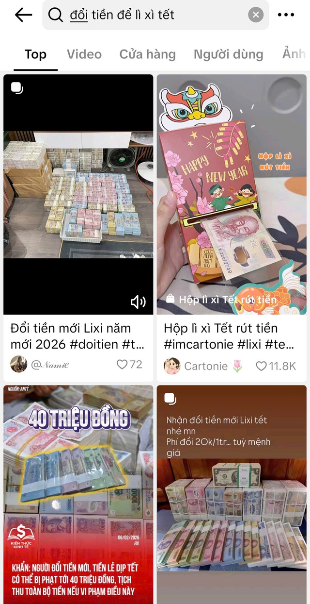 Chỉ cần vài thao tác tìm kiếm trên Facebook, TikTok… với các từ khóa như "đổi tiền mới Tết 2026", "đổi tiền lì xì"… người dùng có thể dễ dàng bắt gặp hàng loạt bài đăng chào mời đổi tiền mới với cam kết "100% tiền chưa lưu thông", "giao tận nơi", "phí thấp".