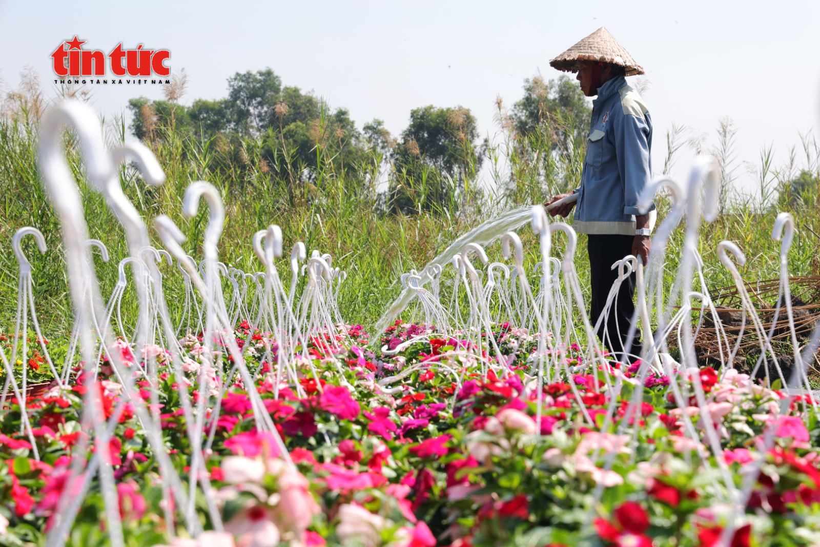Cách vườn bà Cúc không xa, bà Kim Lan, chủ một vườn hoa khác cũng tất bật tưới nước cho những chậu hoa chuẩn bị xuất vườn. Vụ Tết năm nay, gia đình bà trồng khoảng 5 “thiên”, tương đương 5.000 chậu hoa, quy mô lớn đồng nghĩa với áp lực chi phí và rủi ro cũng cao hơn.