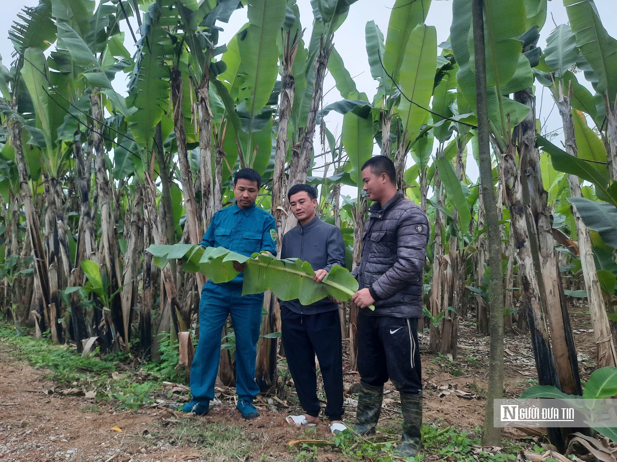 Anh Lộc (đứng giữa) giới thiệu về vườn chuối lấy lá của gia đình.